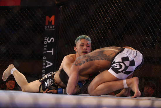 지하격투기 전적 150여전의 늦깎이 기대주 케빈 박(29, CK짐)은 로드FC 리거 이마이 슌야(24, 일본)를 서브미션으로 제압, 지난 아잘렛 타이틀 전 패배의 아픔을 달랠 수 있었다. 거리를 잡으려는 상대의 킥을 캐치해 압박을 걸었던 케빈은 상위를 잡았으나, 서둘지 않고 상대의 태클을 방어, 기회를 엿보았다. 스프롤 후 길로틴 초크가 이어졌다. 이마이가 목과 몸을 틀어 여유를 만들려 했으나, 케빈이 길로틴을 재차 고쳐 잡자, 이마이가 탭으로 항복의사를 표했다.
