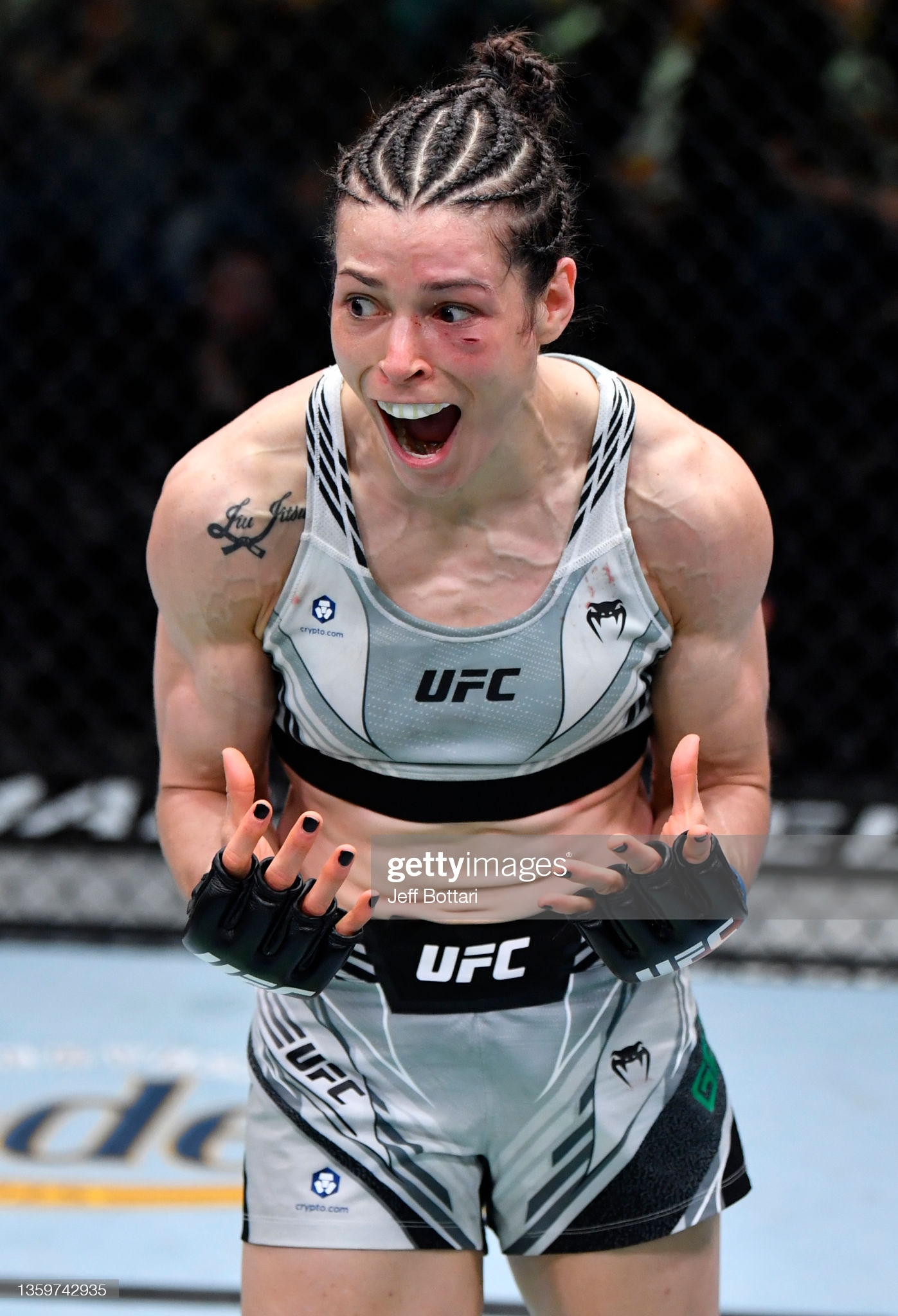 7전 무패의 멜리사 가토(25, 브라질)는 TUF 26의 세미파이널리스트 출신의 베테랑 시지라 유뱅스(36, 미국)를 킥 한 방으로 잡아내고 단체 첫 한 판승과 2연승의 두 마리 토끼를 잡았다. 초반 테이크 다운을 실수한 상대한테 스윕을 당하며 깔린 채 첫 라운드를 보냈던 가토는 놀랍게도 2R에서는 스윕, 막판 초크 시도를 포함 상위 컨트롤로 라운드를 가져갔다. 마지막 3R 초반 발을 세운 미카즈치게리 식 킥에 리버를 허용한 유뱅스가 그대로 다운. 승부가 결정됐다.