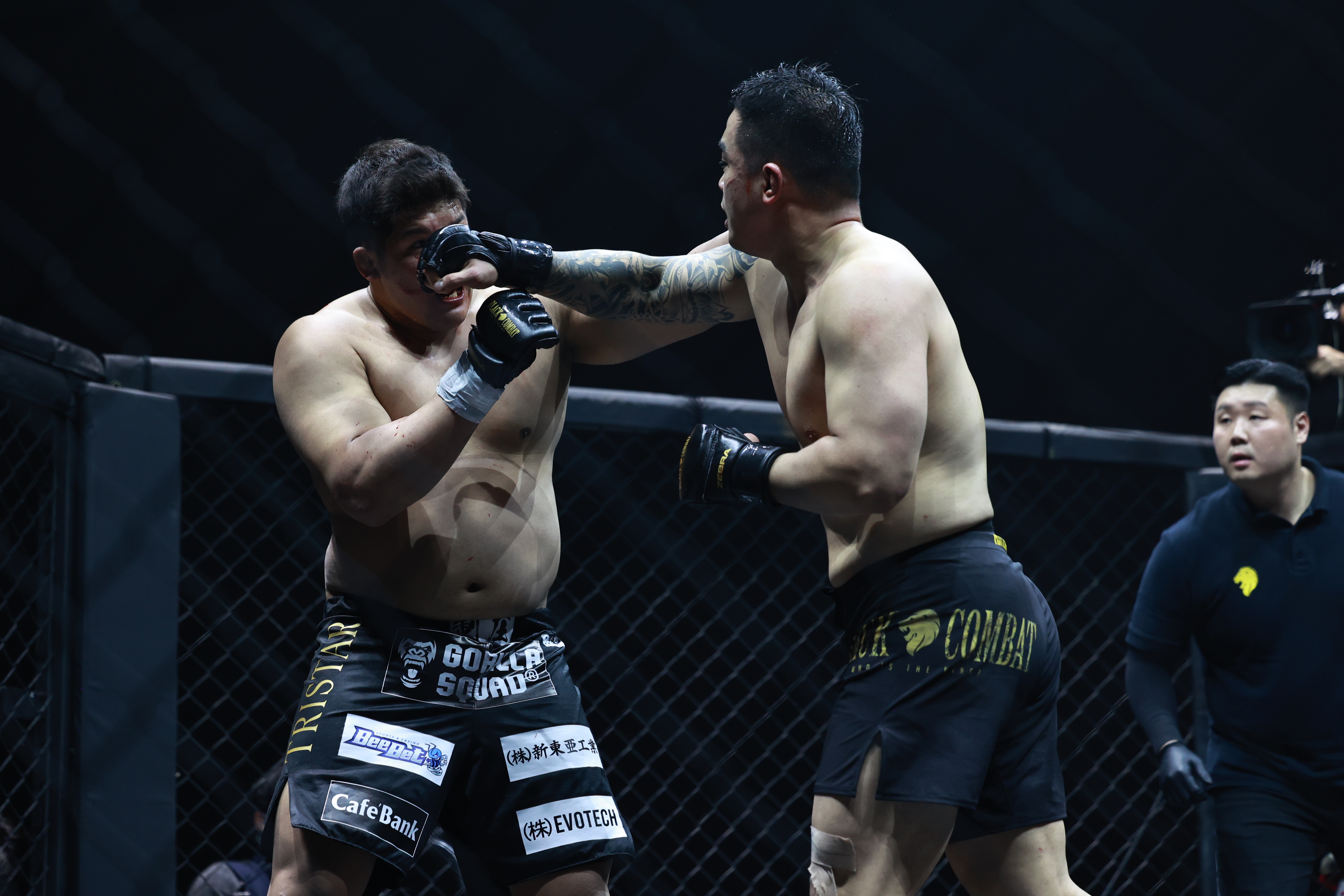 양해준에게 중량급 타이틀을 내줘야 했던 최원준(32, MMA스토리)은 120kg로 증량한 아카자와 유키노리(31, 일본)를 상대로 역전승을 거두고 대항전 승리에 종지부를 찍었다.. 1R 연달은 스플렉스와 카운터 펀치에 한 차례 다운을 당하고도 큰 데미지 없이 버텼던 최원준은 2R부터 팔이 올라가지 않을 정도로 지친 상대에 잽 등 펀치를 박아나가기 시작했다. 3R, 초중반 펀치 압박에 밀린 상대를 레그 트립으로 다운, 상위를 차지한 최원준이 파운딩 연사로 레프리 스탑을 이끌어냈다.