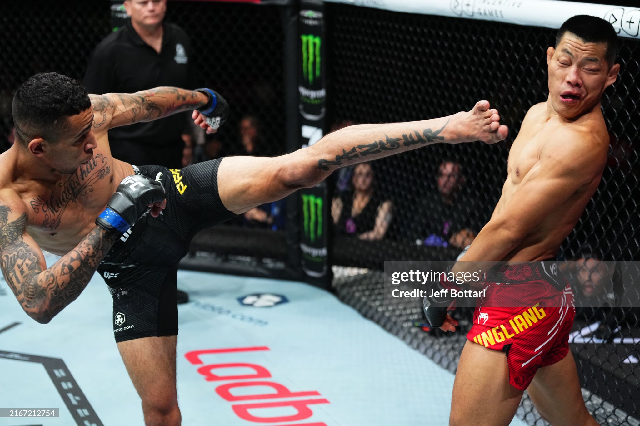 2년여 만에 복귀한 전 웰터급 랭커 리징량(36, 중국)은 프로 첫 KO패배를 기록하는 최악의 복귀 전을 기록했다. 장신의 스트라이커 카를로스 프라테스(31, 브라질)의 월등한 복싱에 두 번이나 플래쉬 다운을 당하며 불안한 출발을 했던 리징량은 꾸준히 전진했지만 2R 초반에도 스트레이트에 다운되는 등, 쉽지 않은 게임을 해야 했다. 결국 레프트에 3방이나 걸린 뒤 케이지 벽에 갇혀 버린 리징량에게 잽-가드를 부수는 라이트에 이은 레프트가 직격, 전투불능으로 만들었다.
