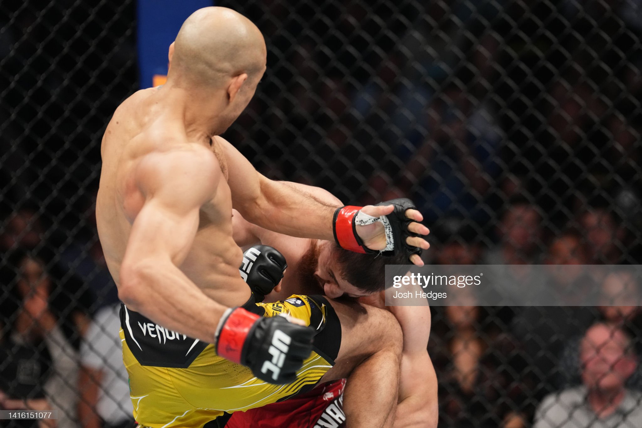 페더급 전 챔프 3위 조제 알도(35, 브라질)는 6위 마랍 다발리쉬벨리(31, 조지아)의 레슬링 압박에 판정패를 기록, 타이틀과의 거리를 줄이는데 재차 실패했다. 3R 막판 한쪽 무릎을 잠깐 꿇은 것을 제외하면 상대의 모든 테이크 다운을 막아낸 알도는 경기 초반 특유의 빠르고 묵직한 로우킥과 바디샷 콤비네이션, 플라잉 니 킥 등을 보여주었으나 2R부터 계속적으로 들어오는 테이크 다운 방어에 타격을 내지 못했다. 3R에는 피치를 올린 상대에 훅까지 허용. 3-0 패배에 일조했다.