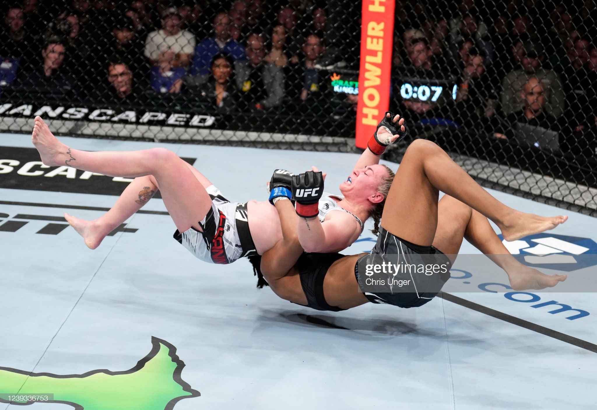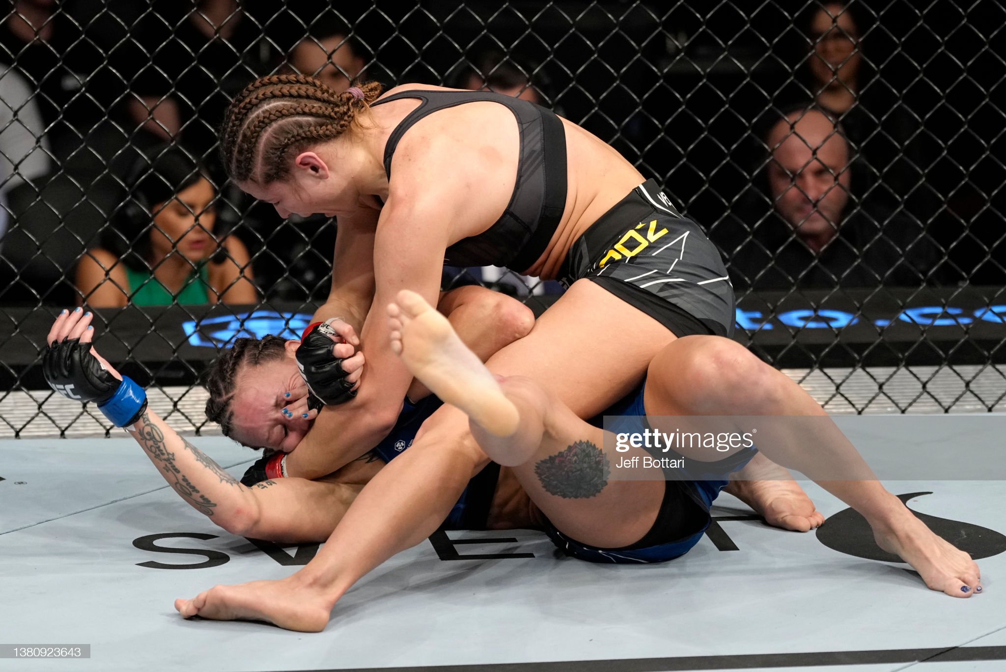 우크라이나의 복싱 챔프 마리나 모로즈(30)는 한 때 팀 메이트이자 카자흐스탄의 복싱 여왕 마리야 아가포바(24)를 초크로 제압, 거의 7년 여만의 서브미션 한 판승으로 전쟁 중인 조국에 위로를 보탰다. 서브미션 실패로 막판 상위를 내줬으나 오랜기간 시도한 백 초크 등으로 1R을 가져간 모로즈는 2R 초반 채자 아가포바를 테이크 다운시키고 상위 포지션을 잡아냈다. 스크램블에 지친 아가포바를 괴롭히던 모로즈가 결국 암트라이앵글 초크를 캐치, 탭을 받아냈다.