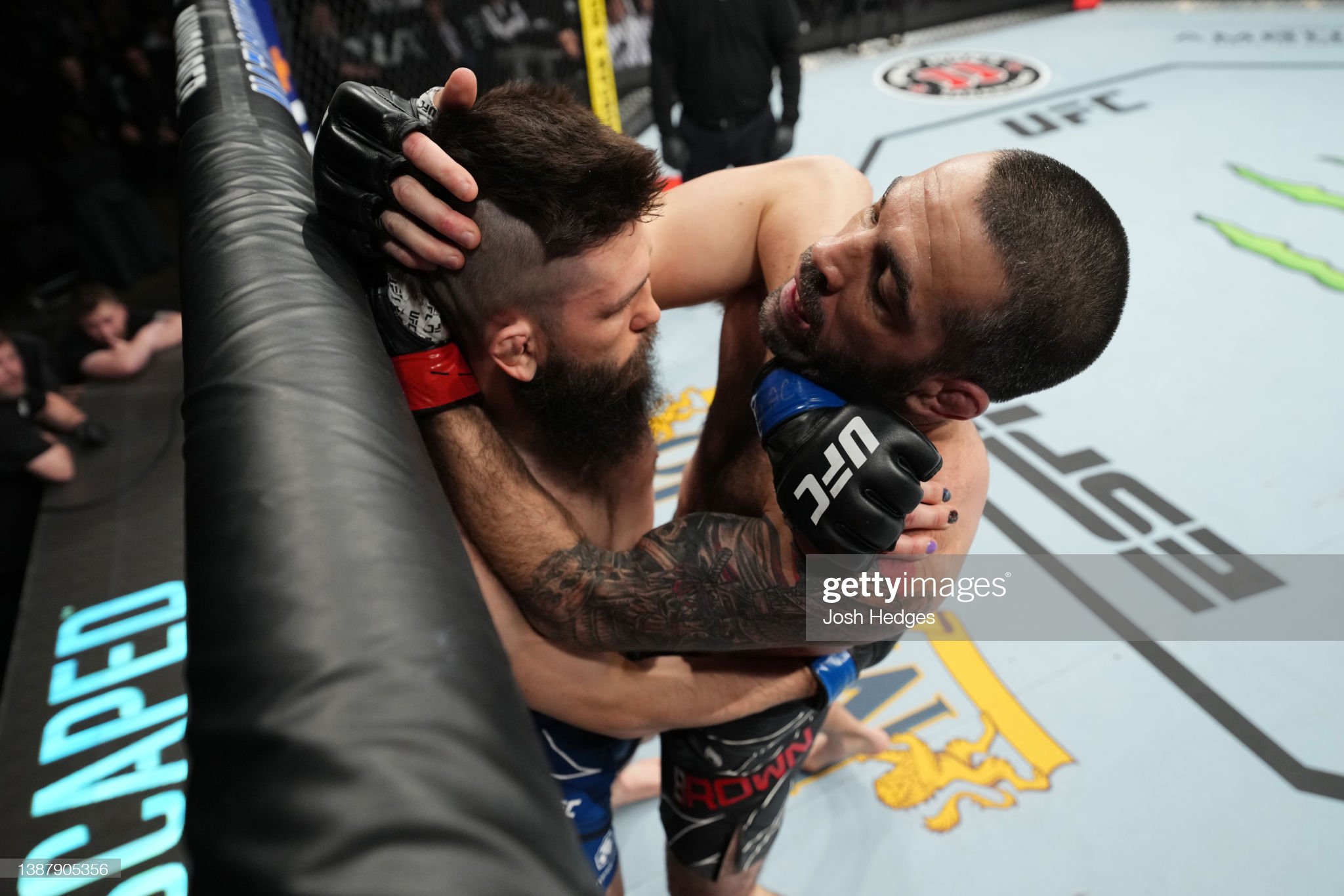 터프가이 브라이언 바바레나(32, 미국)는 난전으로 맷 브라운(41, 미국)에게 판정승리를 거두고 UFC 내  연승행진을 재계하게 됐다. 초반 발목 받치기, 카운터 등 테크니컬한 브라운의 테이크 다운에 쉽지 않은 경기를 펼쳐야 했던 바바레나는 2R 지쳤지만 계속 엘보 니 킥 으로 들어오는 상대에 엘보로 그로기를 만들어 냈다.  이후 브라운이 미들킥, 테이크 다운, 엘보, 니, 펀치로 대항했지만 바바레나가 핑퐁 난전에서 데미지 우위를 보였다. 결국 2-1로 승리. 보너스 확정급 경기.