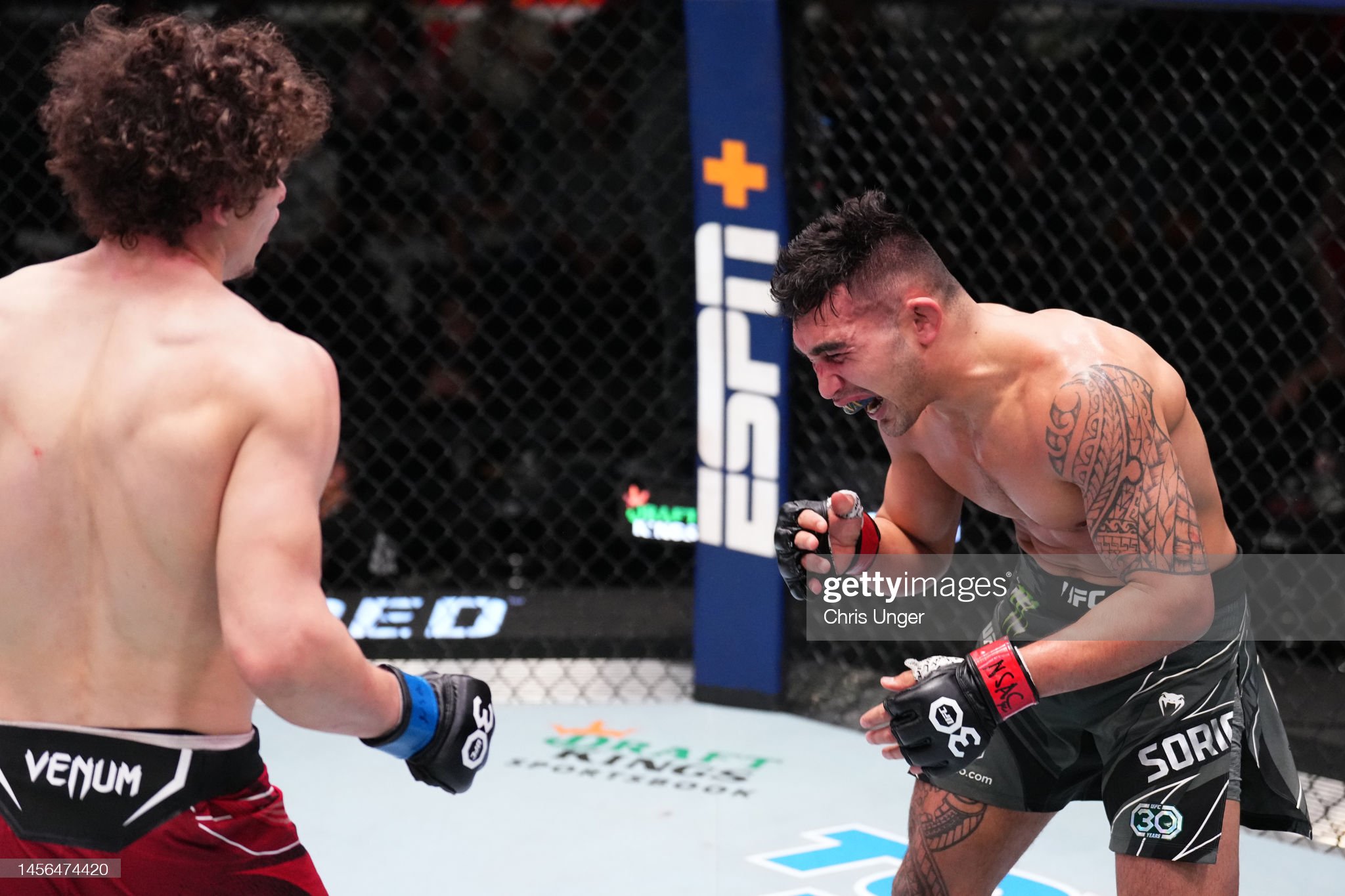 LFA 챔프 간의 일전이었던 2023년 UFC 첫 매치업에서는 올라운더 찰스 존슨(32, 미국)이 동갑내기 그래플러 지미 플립(미국)을 TKO로 잡아내고 UFC 내 첫 연승행진을 개시했다. 플라잉 트라이앵글 초크까지 성공시킬 정도의 실력파인 플립의 초반 태클을 뒤집으며 경기를 시작한 존슨은 묵직한 바디샷, 가드를 뚫는 하이킥으로 스탠딩의 우세를 가져갔다. 결국 슬램을 성공시켰지만 백 유지에 실패 플립에 엘보로 컷까지 만든 존슨이 두파운딩으로 레프리 스탑을 이끌어냈다.