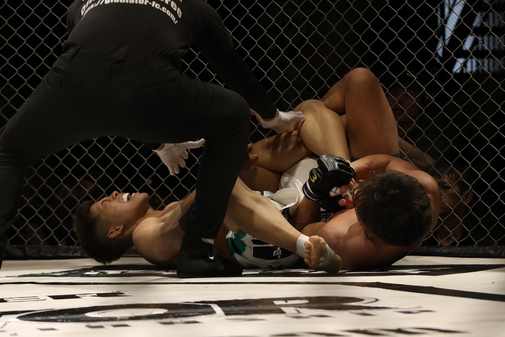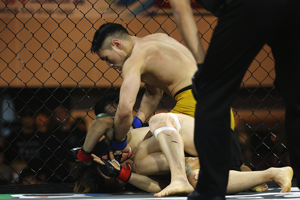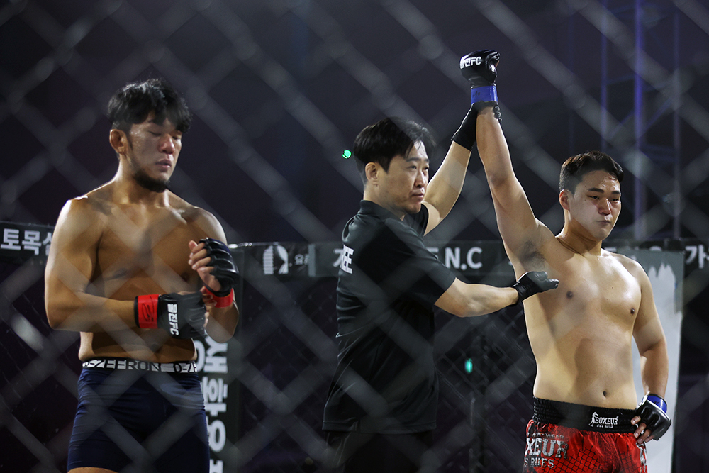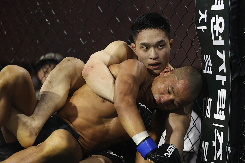오웅빈(더짐랩)이 서브미션 한판 승으로 1승을 추가했다. 전날 계체로 패널티를 받아 판정으로 경기가 끝날 경우 승리할 방법이 없었던 오웅빈은 초반 타격전 중 이수민(팀피니시)의 카운터 테이크 다운에 상위 포지션까지 빼앗기고 말았다. 그러나 차분히 패스를 시도하는 상대를 가드에 가둔 오웅빈은 기무라 락 등으로 기회를 노리다가 삼각까지 연결, 트라이앵글 암 바를 시작했다. 이수민이 몸을 틀어 빠져나가려 애썼으나 오웅빈이 그대로 암 바를 연결, 탭까지 받아낼 수 있었다.