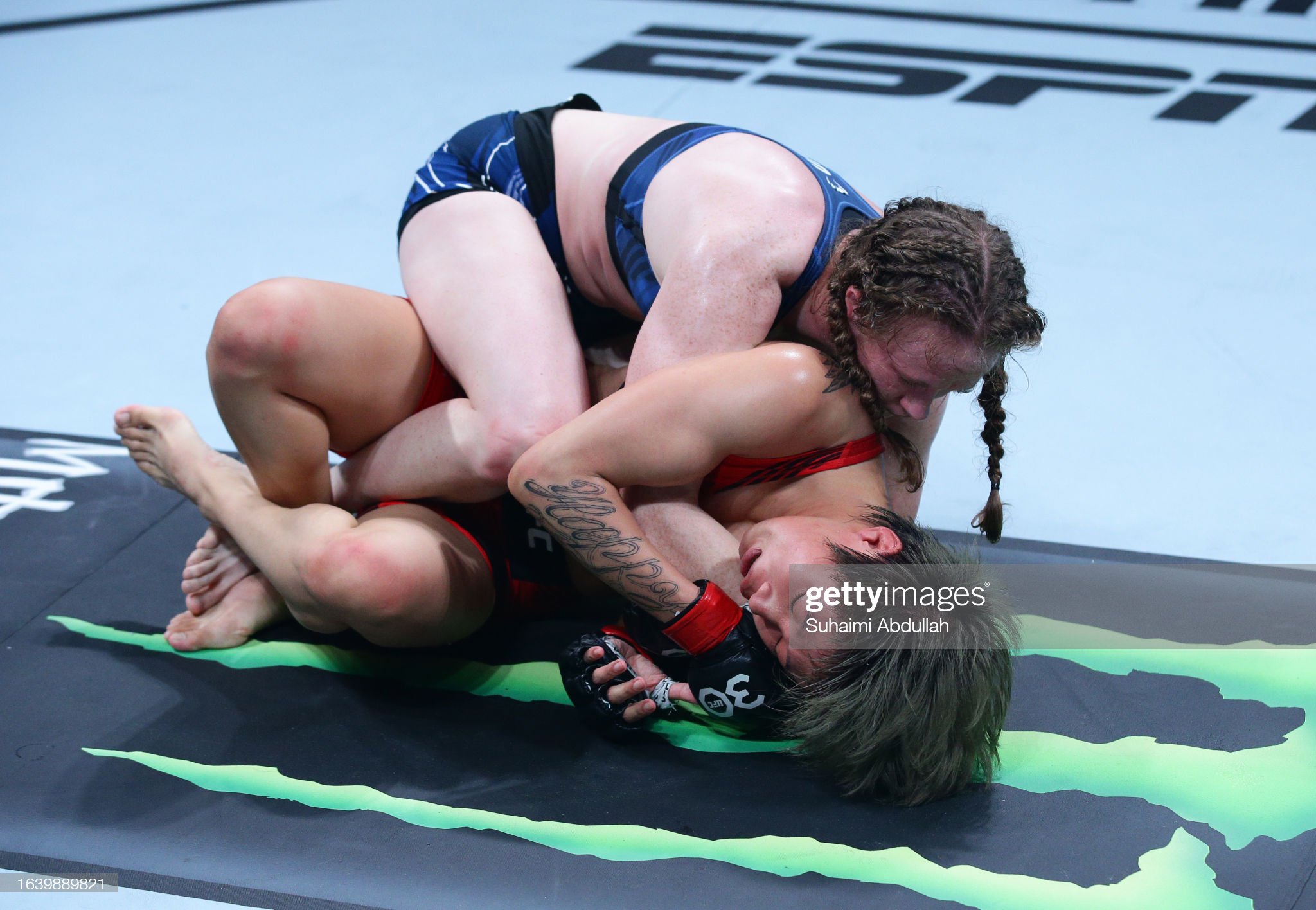 타이틀 탈환에 성공 후 첫 타이틀 방어전에 나선 스트로급 챔피언 장웨일리(34, 중국)는 압도적인 레슬링으로 도전자 아만다 레모스(36, 브라질)를 제압, 완봉 판정으로 타이틀 방어에 성공했다. 레모스의 장기인 닌자 초크에 한 차례 위협을 당하긴 했으나, 테이크 다운 후 지속적으로 눌러두며 파운딩을 퍼부은 장웨일리는 스탠딩에서도 엘보와 잽 성 사이드 킥을 써가며 흐름을 내주지 않았다. 크루시픽스를 십분 활용, 마지막까지 알뜰히 챙긴 장에게 심판 전원의 지지가 내려왔다. 3-0승.