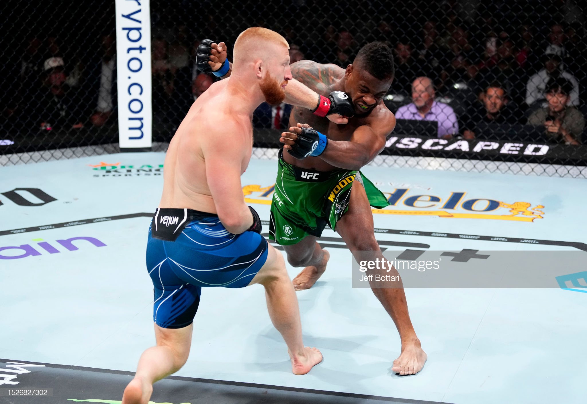 22년 컨텐더 리거 나짐 사디코프(29, 아제르바이잔)는 19년 컨텐더 리거로 UFC 본선 선배인 테렌스 맥키니(28, 미국)에게 근사한 서브미션 역전승을 챙기고 단체 내 첫 연승행진을 시작했다. 사디코프는 종료 40여초를 남겨두고 포지션 뒤집기에 성공했지만, 백을 빼앗긴 채 RNC 등에 컨트롤 당하며 1R을 내줬다. 허나 2R 초반 원투를 히트시킨 사디코프가 스크램블 끝에 테렌스의 백을 차지했다. 잠시 후 왼쪽 팔이 등 뒤로 제압당한 상대의 목을 사디코프가 RNC로 캐치, 탭을 받아냈다.