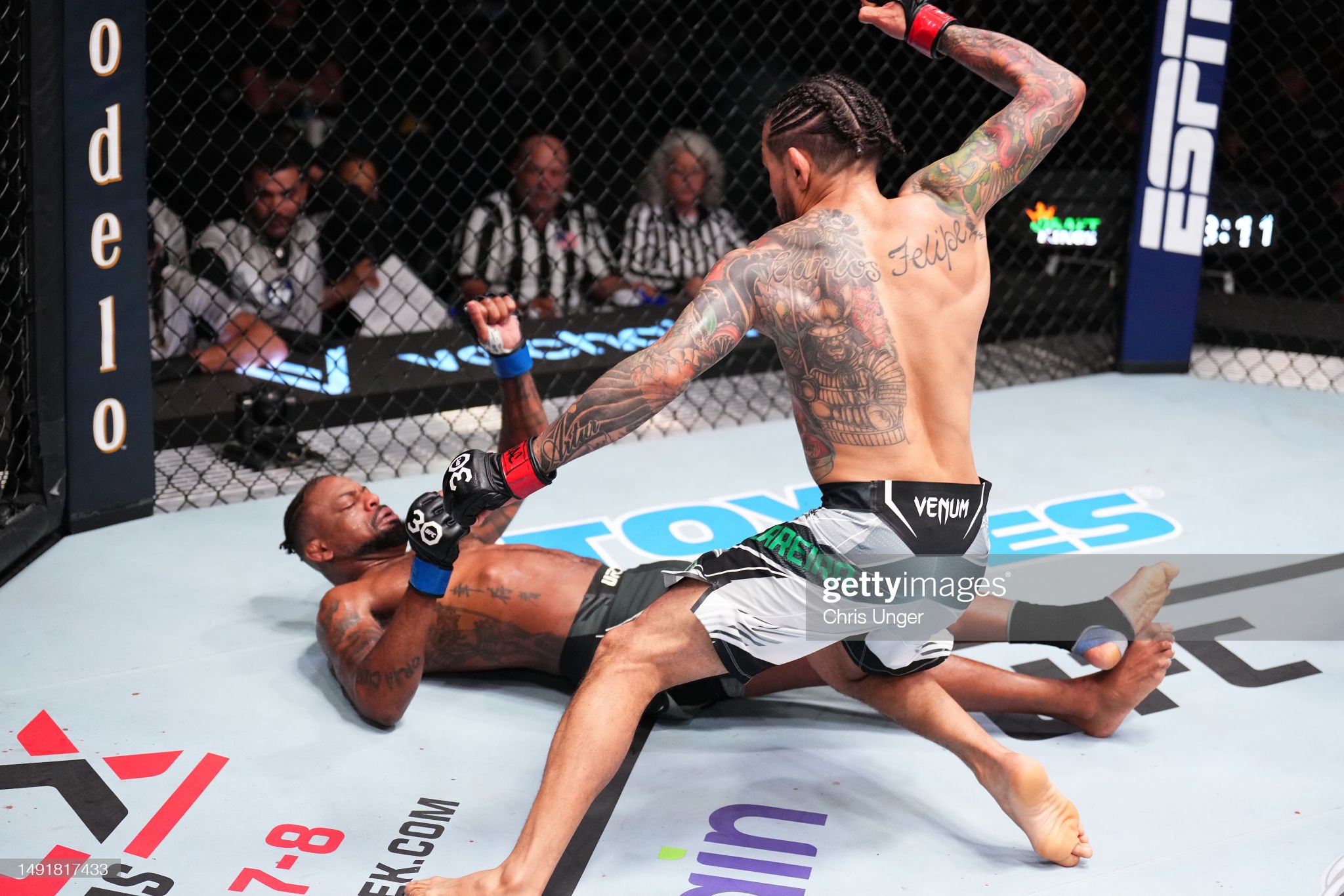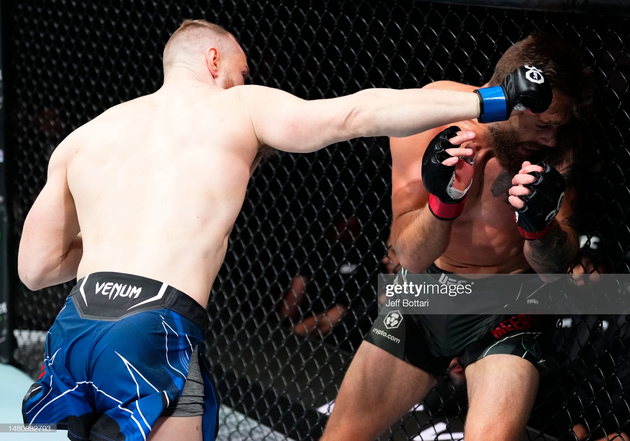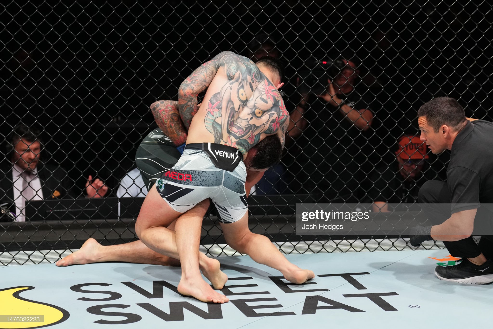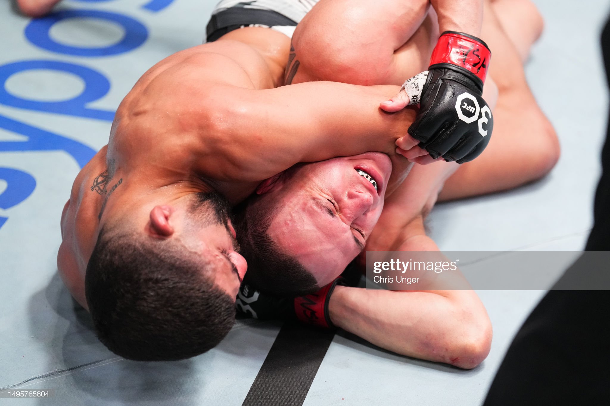 MMA 프로 전적 45전의 베테랑 다니엘 피네다(37, 미국)은 서브미션으로 간만에 승리를 맛봤다. 20년 12월 컵 스완슨 전 이후 오랜만에 경기에 나선 피네다는 기대주 터커 루츠(28, 미국)을 상대로 1R과 2R 플래쉬 다운을 뽑아내며 경기를 리드했다. 스크램블로 그라운드에서 상위를 잡은 피네다는 엉덩이를 뒤로 빼 케이지에 기댄 상대의 목을 알리 포지션에서 캐치, 탭을 받아내고 1승을 추가해 냈다.