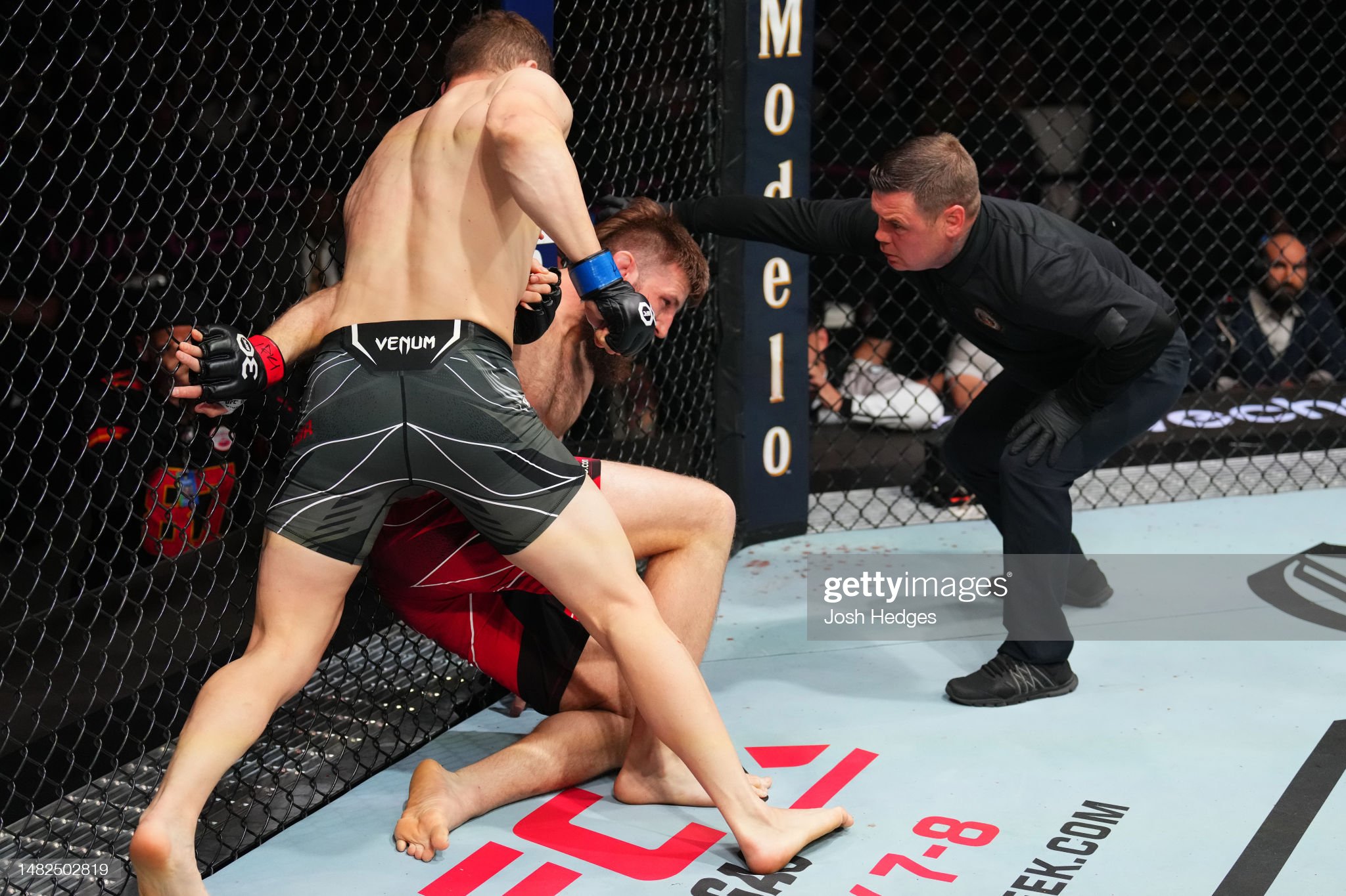 [나이모프의 카운터에 다운된 멀라키와 이를 지켜보는 레프리 허브 딘]