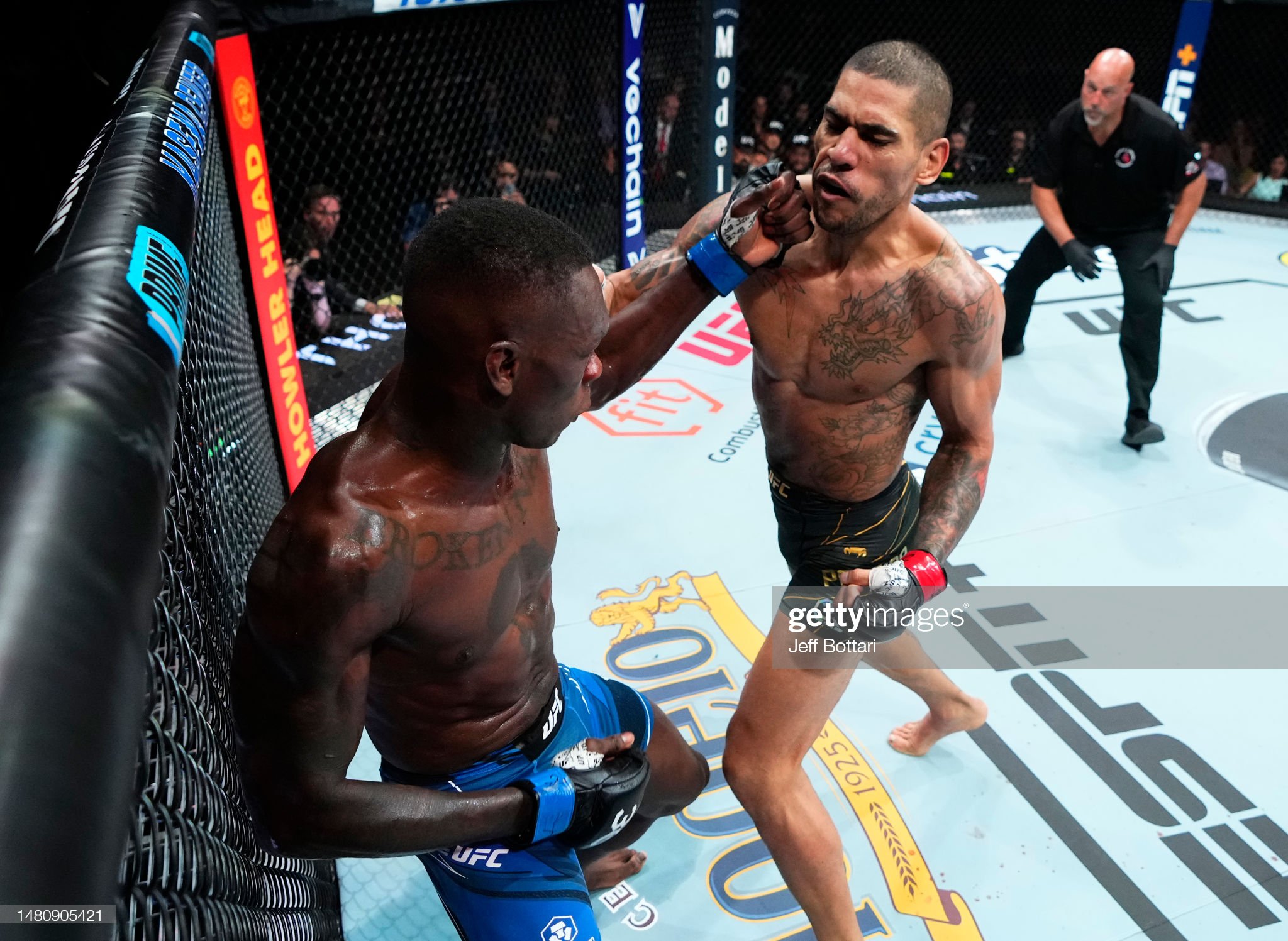 미들급 타이틀 전에서는 알렉스 페레이라(35, 브라질)를 이스라엘 아데산야(31,나이지리아)가 KO로 잡아내고 타이틀 탈환과 리벤지 두 마리 토끼를 잡았다. 카프킥 등 상대의 타격에 애를 먹던 아데산야는 바디샷 교환 후 로우킥에 케이지에 등을 기대고 커버를 올리며 함정을 팠다. 기회를 잡아다고 판단한 페레이라가 러쉬를 감행했고, 빈틈을 놓치지 않은 아데산야가 숏 레프트와 라이트를 맞췄다. 페레이라가 몸을 그대로 다시 올리는 실수를 하자 원투가 재차 작렬, 승부가 결정됐다.