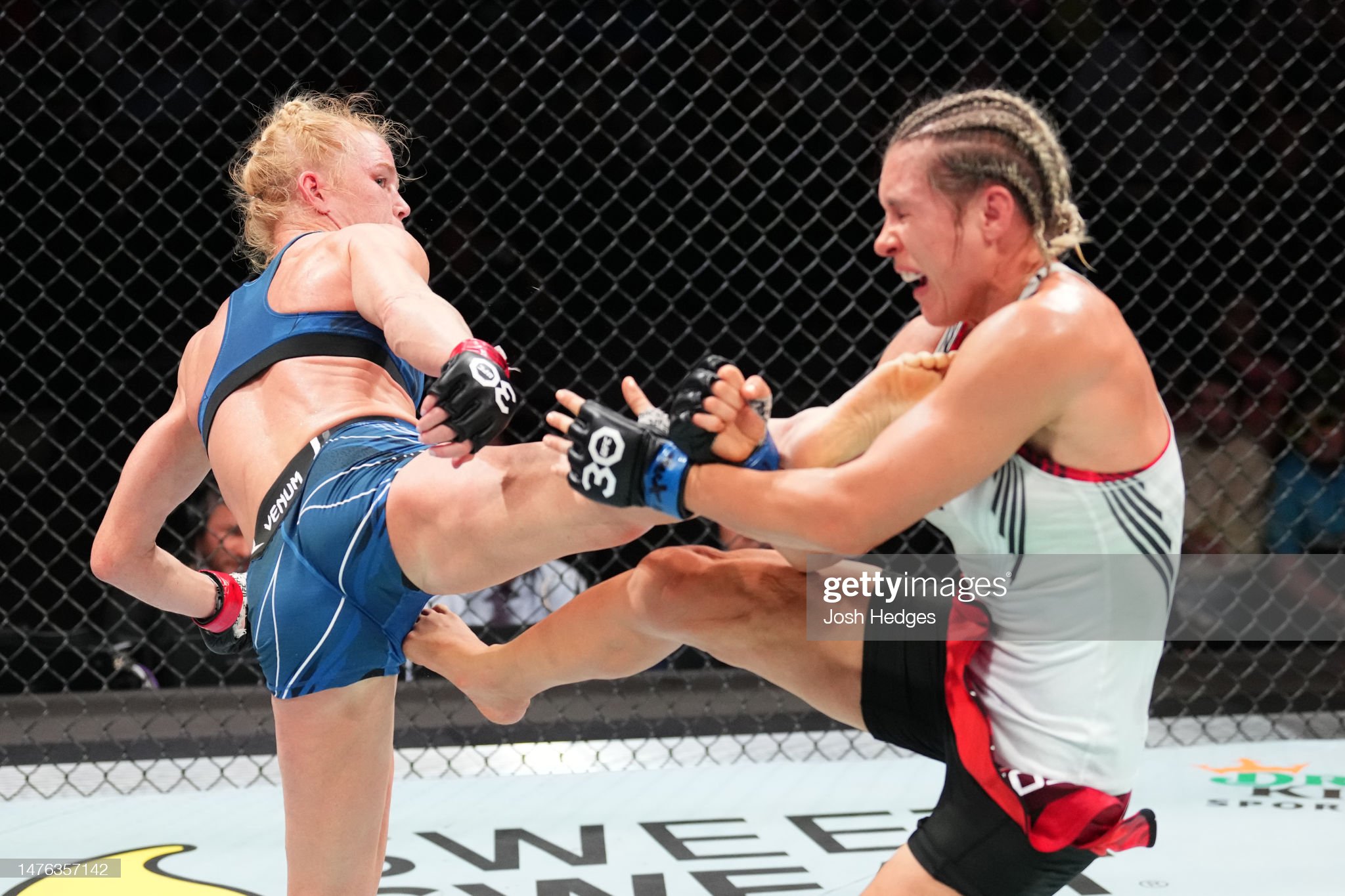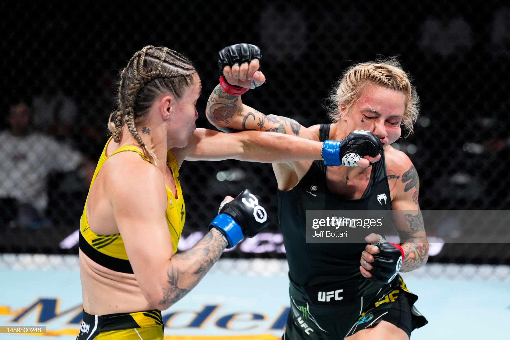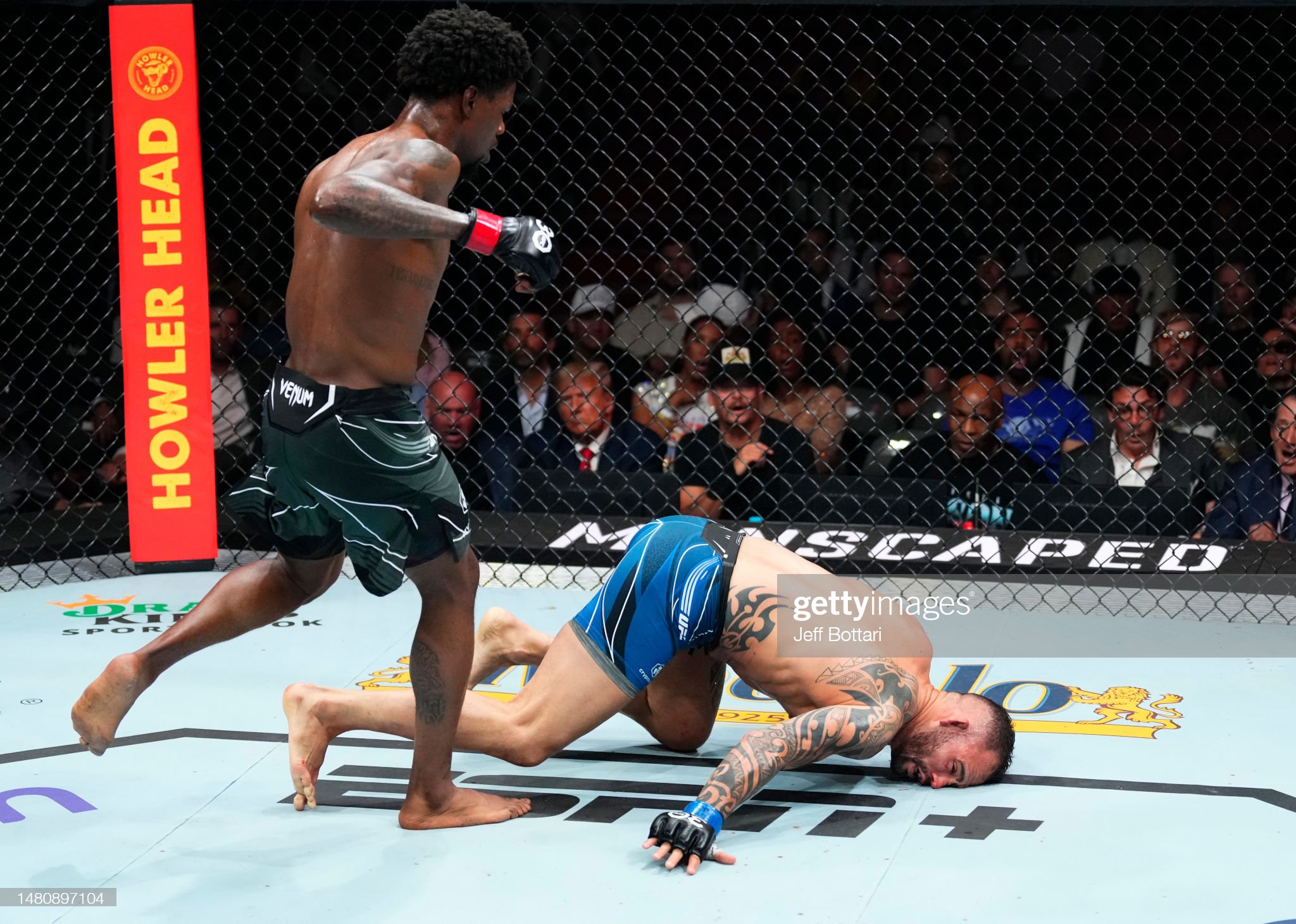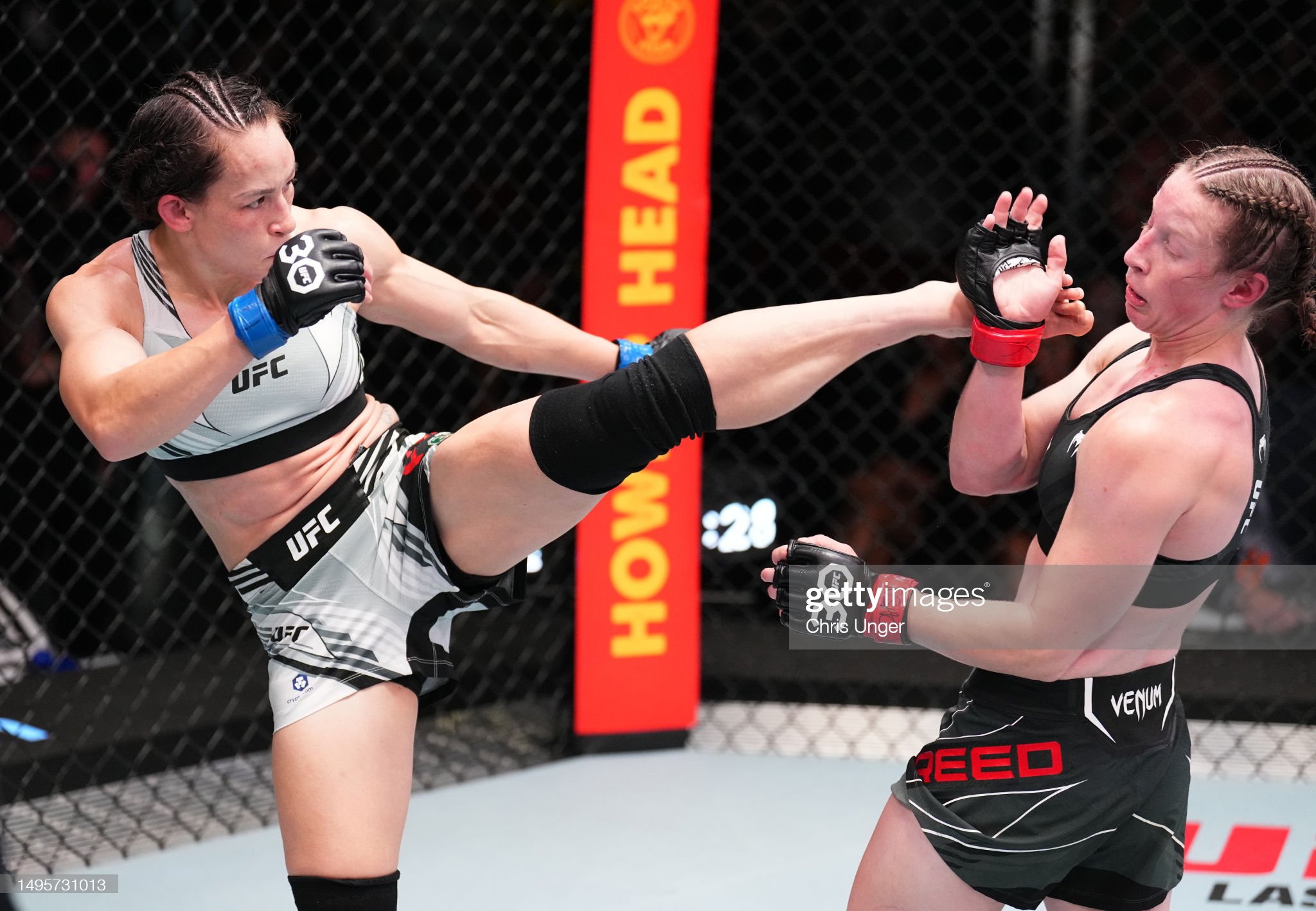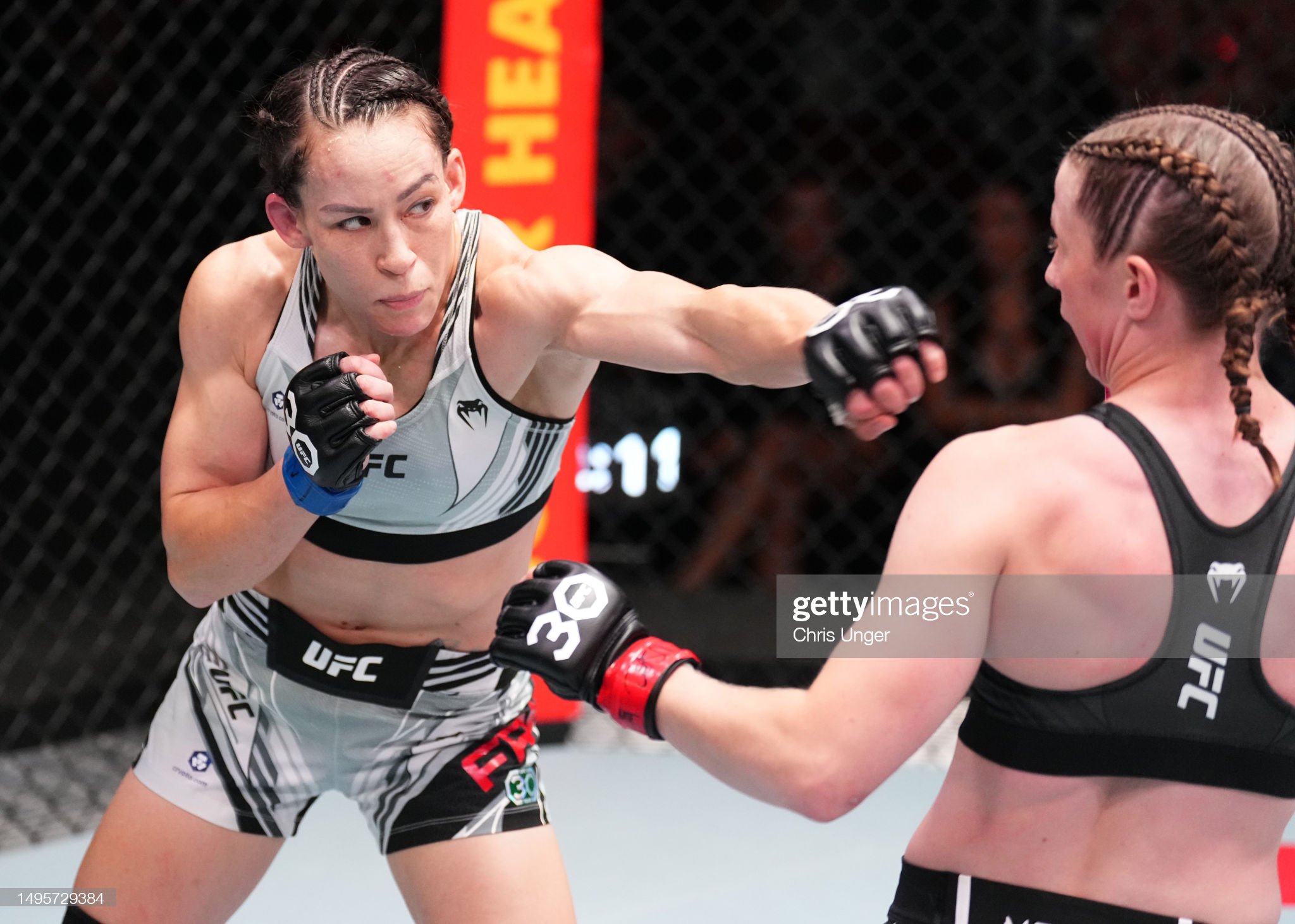 최근 이혼 조정 중인 주짓수 여제이자 여자 스트로급 8위 맥켄지 던(30, 미국)은 발전한 타격을 붙인 압도적 그라운드 타격으로 판정승을 챙기며 위안을 찾을 수 있었다. 1R부터 깜짝타격으로 14위 안젤라 힐(38, 미국)을 그로기에 빠뜨렸던 던은 욕심부리지 않는 힐의 클린치 게임에 2R을 내줬으나, 3R에서도 카운터 니 킥으로 또다시 다운을 뽑아냈다. 4R에서도 우위를 놓치 않은 던은 마지막 5R, 힙 토스 후 패스를 성공, 파운딩과 암 바 시도로 끝까지 우위를 놓지 않았다. 3-0 판정승리.