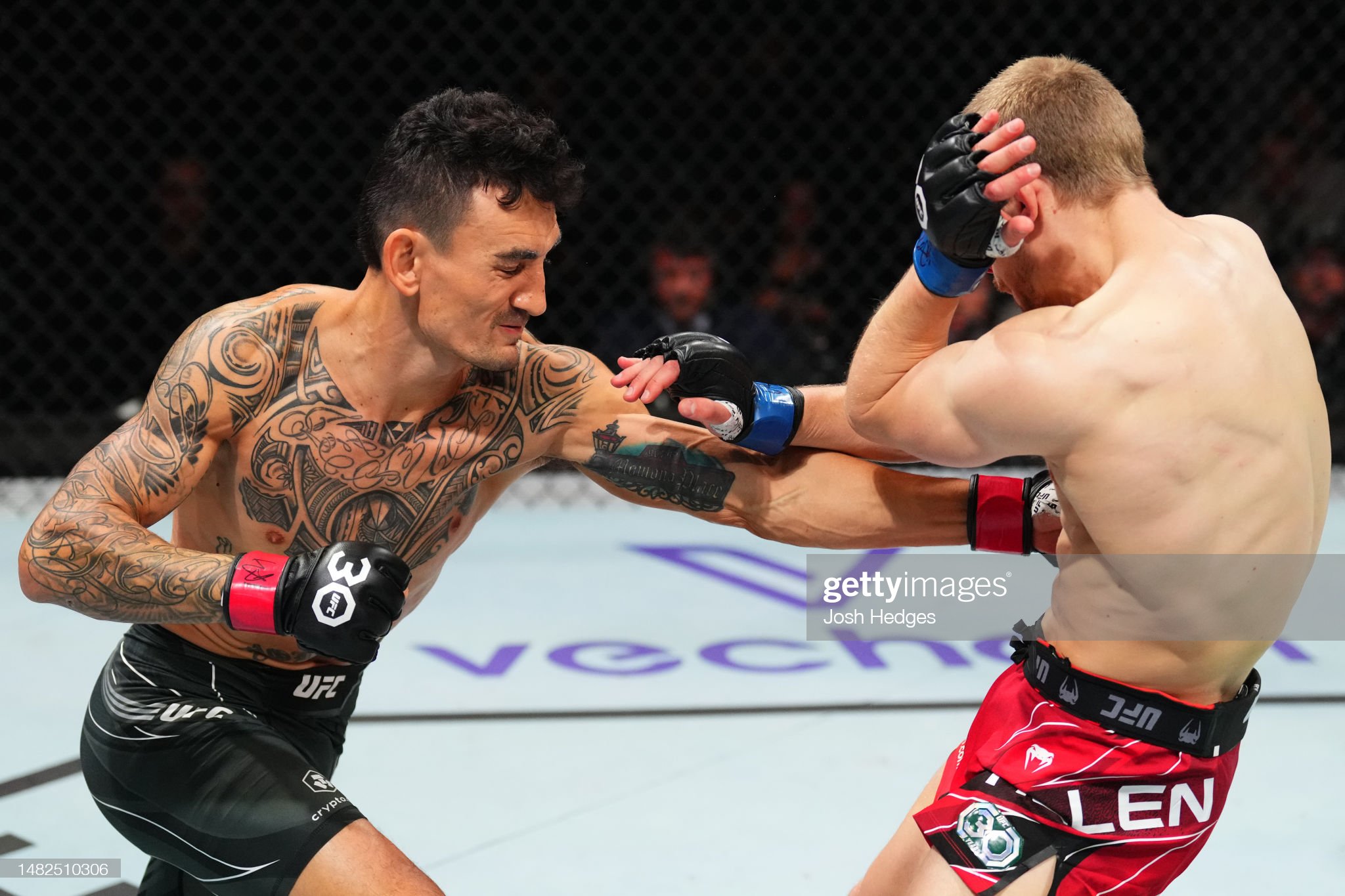 전 페더급 챔프 겸 2위 맥스 할로웨이(31, 미국령 하와이)는 묵직한 펀치를 가진 4위의 복서 아놀드 앨런(29, 미국)를 3-0 판정으로 제압, 통곡의 벽으로 남았다. 평소의 볼륨타격 대신 복부와 안면을 두들기며 1R을 챙긴 할로웨이는 묵직한 펀치를 연달아 내주고 2R을 내주자, 오소독스로 스위치, 킥 거리를 만들어 운영에 더욱 집중했다. 앨런은 몇 차례 좋은 펀치를 만들었지만 할로웨이는 그대로 버텨냈고, 급히 압박하다 할로웨이에게 플래쉬 다운을 내주고 경기를 마치고 말았다.