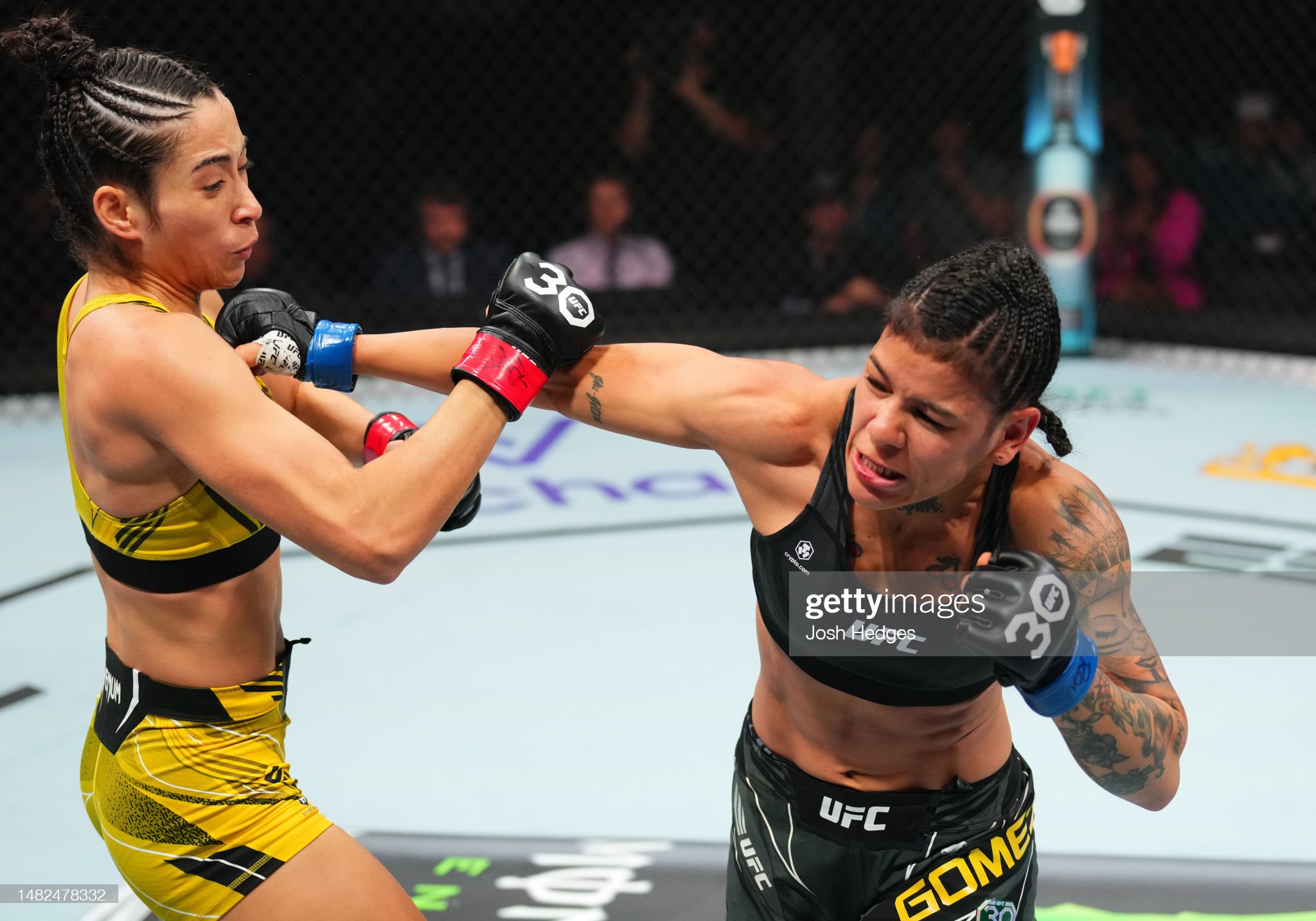 컨텐더 출신의 신입 브루나 브라질(29, 브라질)을 상대로 UFC 본선 두 번째 경기에 나선 데니즈 고메즈(23, 브라질) TKO승으로 단체 입성 후 첫 승을 거두었다. 고메즈는 저돌적인 압박으로 상대의 테이크 다운을 파훼, 엘보, 니 킥과 라운드 종료 직전 테이크 다운 등으로 첫 라운드를 자신의 것으로 만들었다. 2R 중반 케이지 중앙에서 커버를 올리고 있던 고메즈는 펀치 러쉬를 감행, 물러나며 카운터를 날리던 상대를 펀치로 다운시켰고, 파운딩을 찌그러뜨려 승리를 완성했다.