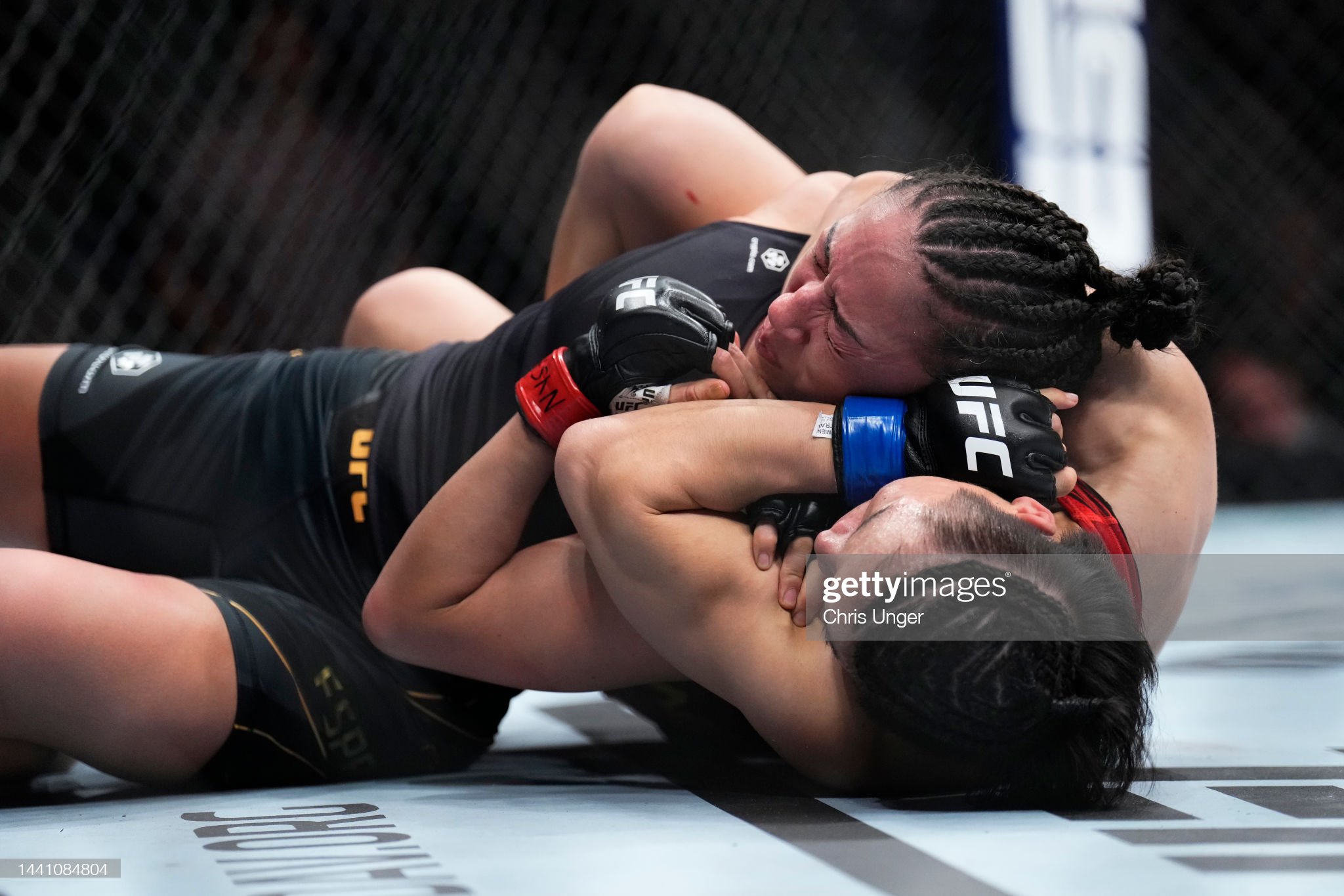 [크루시픽스를 잠근 장웨일리가 에스프라자의 목에 초크를 가하고 있다]