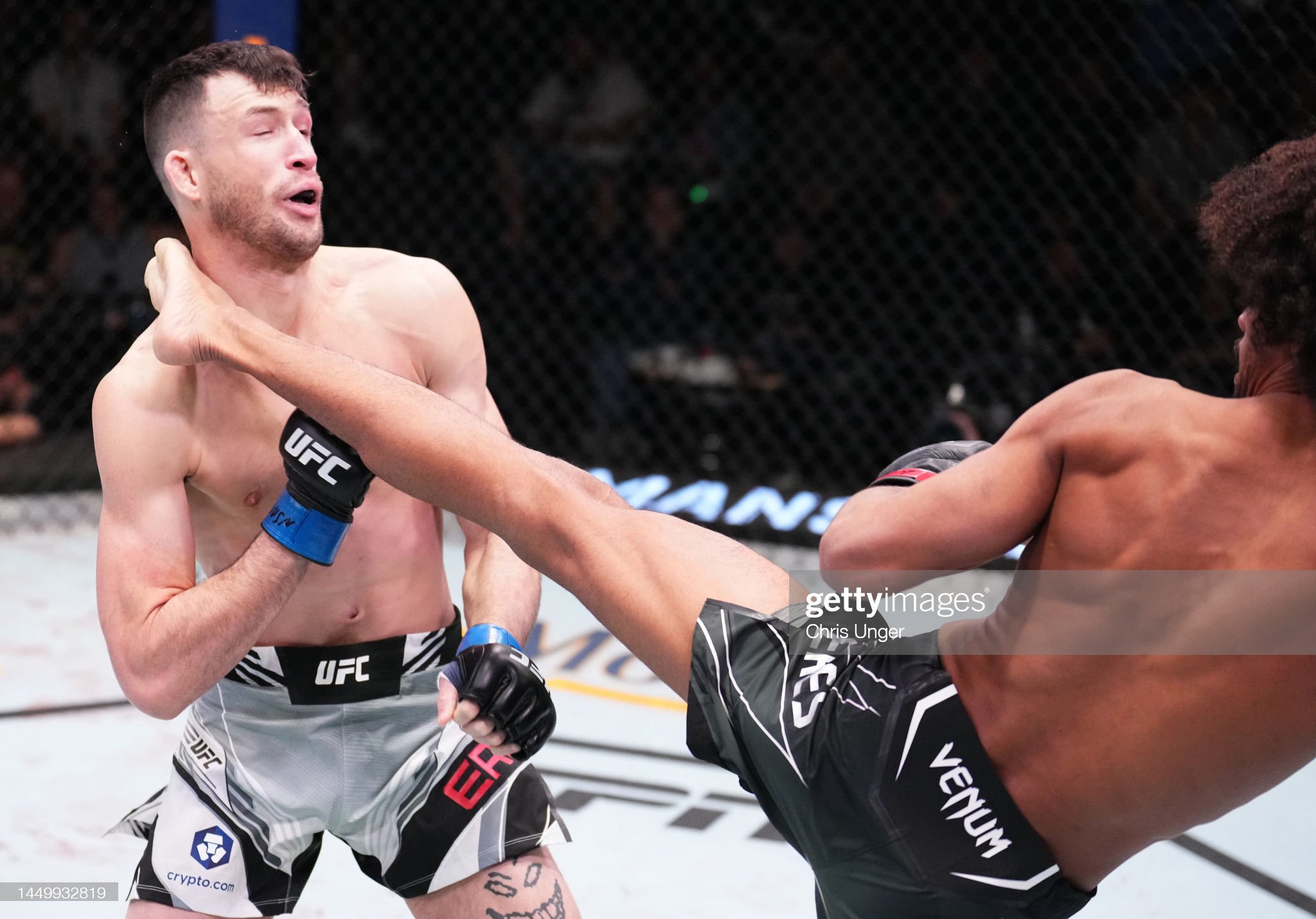 미들급 8위 잭 헤르만손(34, 스웨덴)을 상대로 첫 대 랭커 전에 나선 로만 돌리체(34, 조지아)는 근사한 서브미션을 곁들인 TKO승으로 TOP 10 진입에 성공했다. 근사한 스윕을 성공시켰지만, 상대의 그래플링과 타격 리치에 쉽지않은 첫 라운드를 보내야 했던 돌리체는 2R에도 상위를 내줬으나 몸을 돌려 나가려던 빠져나가려던 상대의 다리를 칼프 슬라이서로 캐치해냈다. 그립을 유지한 채 상위로 간 돌리체는 몸을 움직이지 못하는 헤르만손에 파운딩으로 역전 TKO승을 뽑아냈다.