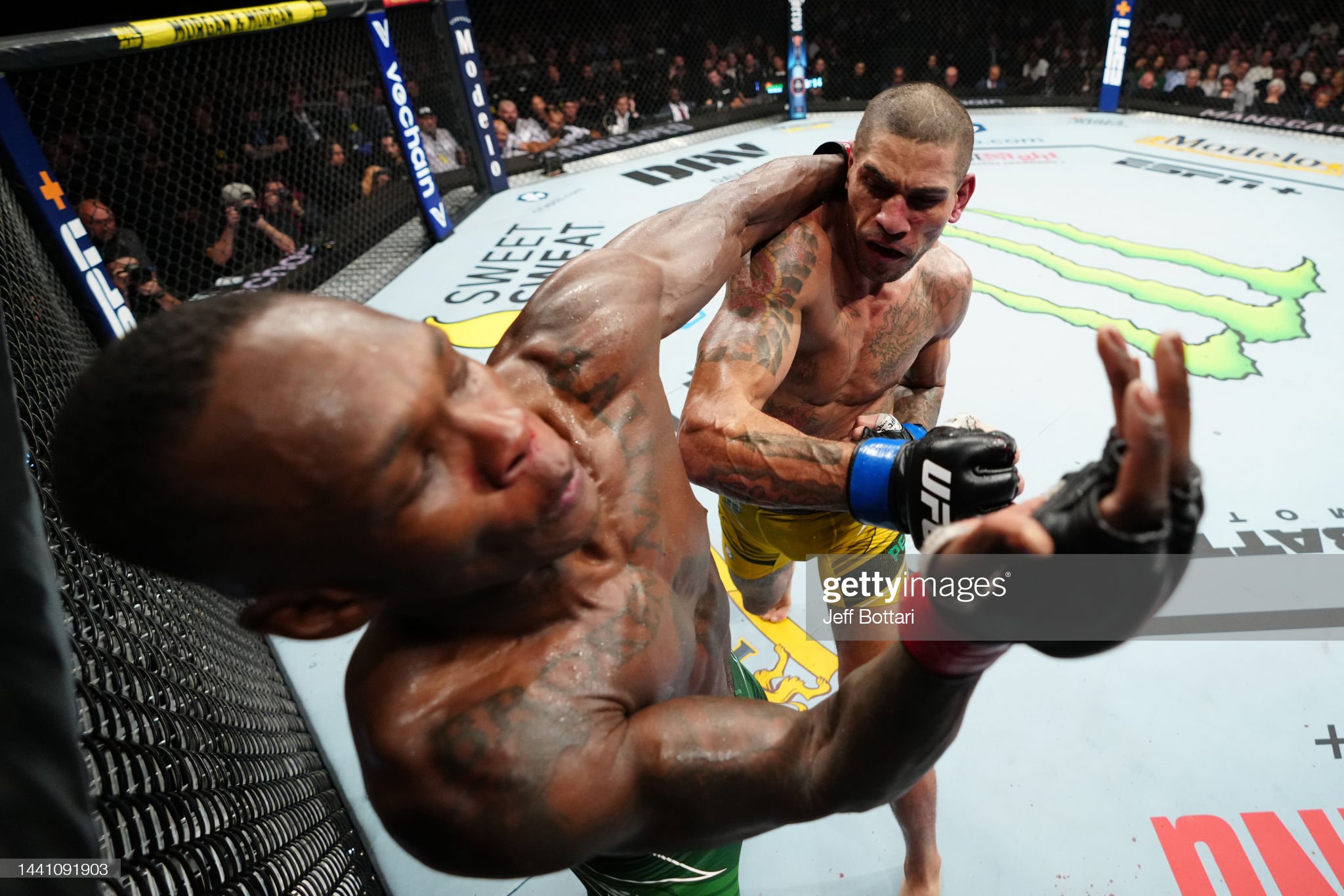 [UFC 281 'Adesanya vs. Pereira' 결과] 14경기: 이스라엘 아데산야 < 알렉산더 페레이라 (TKO 5R 2:01) * 미들급 타이틀 전 13경기: 칼라 에스파르자 < 장웨일리 (리어네이키드 초크 2R 1:05) * 女 스트로급 타이틀 전 12경기: 더스틴 포이리에 > 마이클 챈들러 (리어네이키드 초크 2R 3:00) 11경기: 프랭키 에드가 < 크리스 구티에레즈 (TKO 1R 2:01) 10경기: 댄 후커 > 클라우디오 푸헬레스 (TKO 2R 4:06) 09경기: 브래드 리델 < 헤나투 '모이카노' 카네이로 (리어네이키드 초크 1R 3:20) 08경기: 도미닉 레예스 < 라이언 스팽 (KO 1R 1:20) * 93.71kg=206.6lb계약 07경기: 에린 브랜치필드 > 몰리 맥칸 (기무라 락 1R 3:37) 06경기: 안드레 페트로스키 > 웰링턴 터먼 (판정 3-0) 05경기: 맷 프레볼라 > 오트맛 아자이터 (KO 1R 2:30) 04경기: 카롤리나 코왈케비츠 > 실바나 고메즈 후아레즈 (판정 3-0) 03경기: 마이클 트리자노 > 최승우 (TKO 1R 4:51) * 66.95kg=147.6lb 계약 02경기: 훌리오 아르세 < 몬텔 잭슨 (판정 0-3) 01경기: 카를로스 울버그 > 니콜라이 네구메리아누 (KO 1R 3:44)