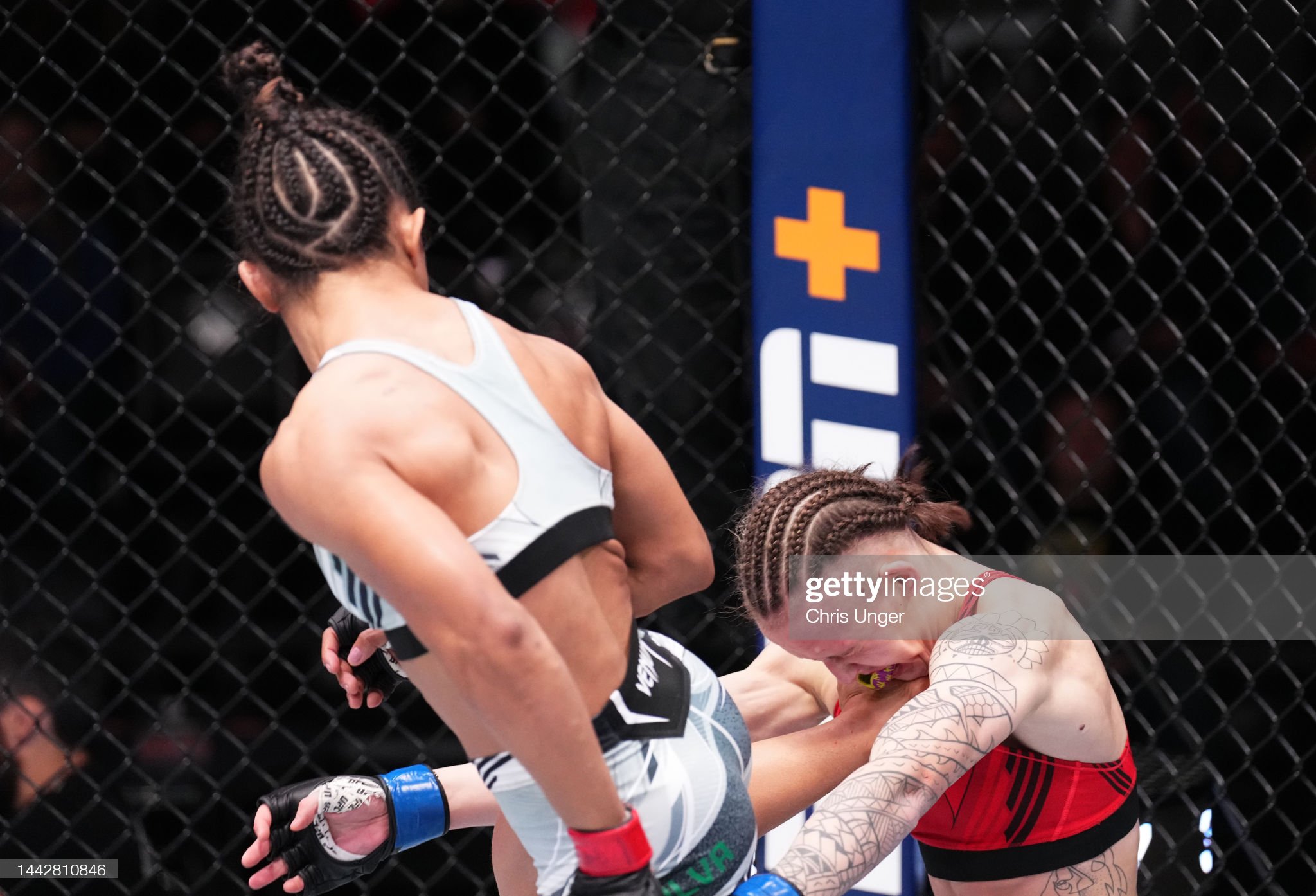 UFC 2차전에 나선 나탈리아 시우바(25, 브라질)은 하이라이트 릴에 남을 만한 피니쉬로 KO승을 획득, 단체 내 첫 연승행진을 개시했다. 컨텐더 리거로 UFC 첫 경기에 임한 프로 6전 무패의 테레자 블레다의 끈질긴 그래플링에 1R, 타이트한 트라이앵글을 내주며 위기를 맞기도 했던 시우바는 한 수위의 타격으로 경기를 리드하는 한 편, 상대의 태클을 막아내 체력을 갉아 냈다. 결국 케이지에 몰렸다 태클을 치던 블레다의 목과 턱 사이로 시우바의 백 스핀 킥이 작렬, 승부를 결정지었다.