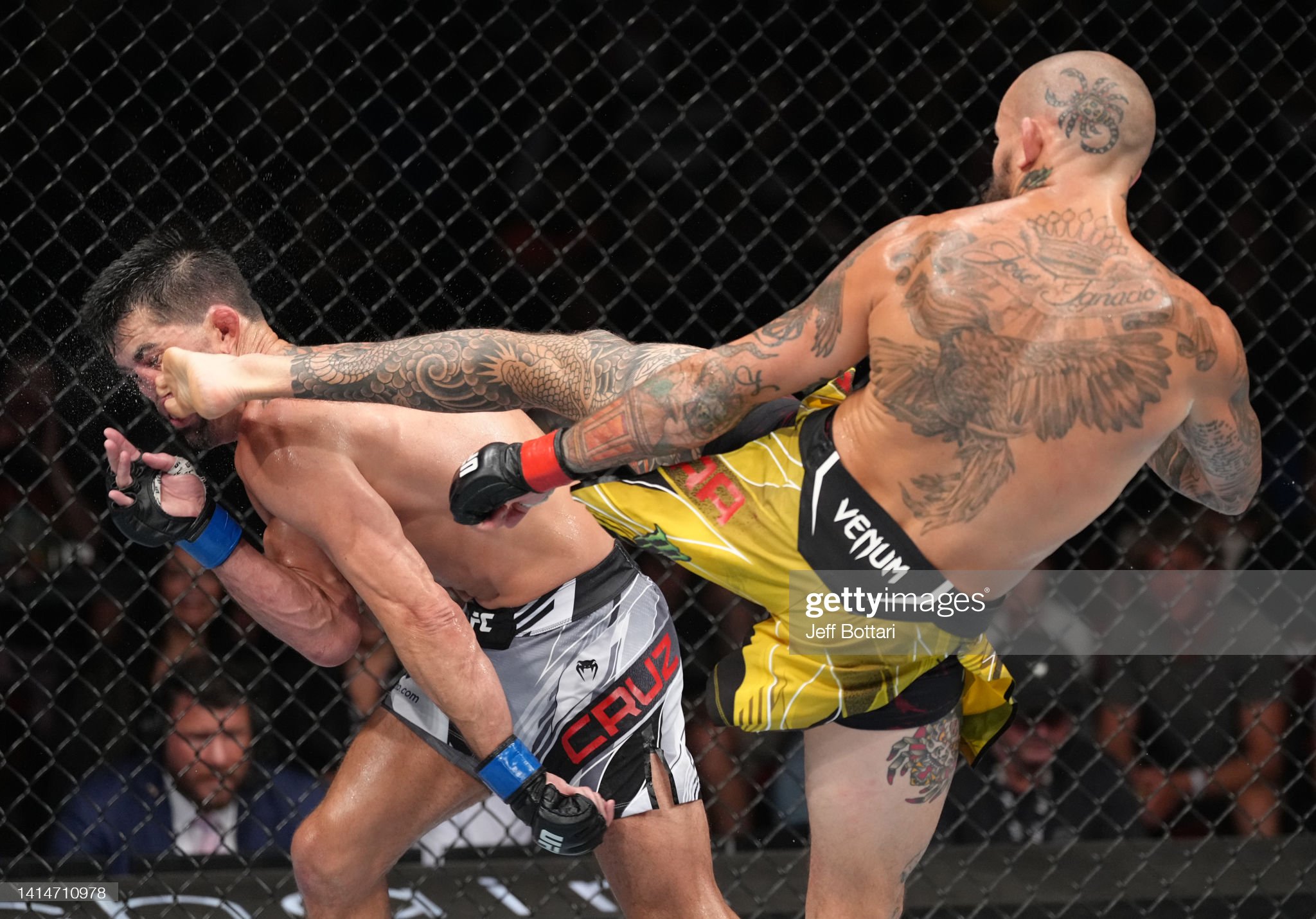 밴텀급 5위 말론 베라(29, 에쿠아도르) 역전 KO로 전 챔프이자 8위 도미닉 크루즈(37, 미국)의 복귀 전을 망쳐 버렸다. 1R 로우킥 카운터로 펀치 플래쉬 다운을 만들긴 했지만 크루즈 특유의 풋워크를 살린 볼륨 타격과 테이크 다운에 끌려다니기 바빴던 베라는 3R, 풋워크 중 무릎 데미지를 입은 상대에게 다운을 뽑으며 활로를 찾기시작했다. 결국 4R, 초반에도 다운을 뽑은 베라가 팔을 톡 치자 돌아나가기 위해 숙인 크루즈의 안면을 걷어차 전투불능을 만들어 종지부를 찍었다.