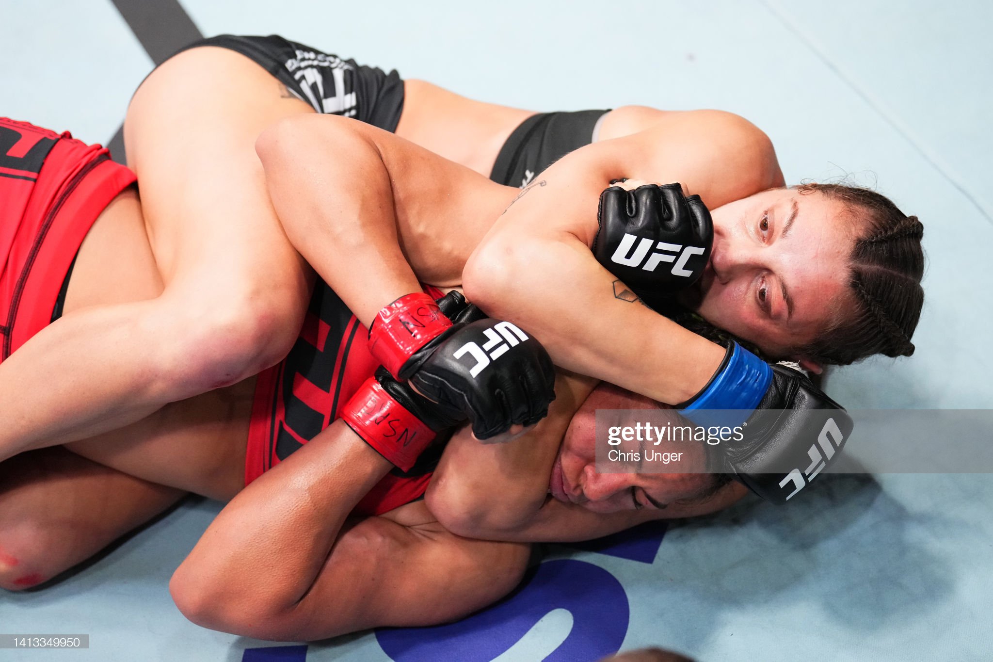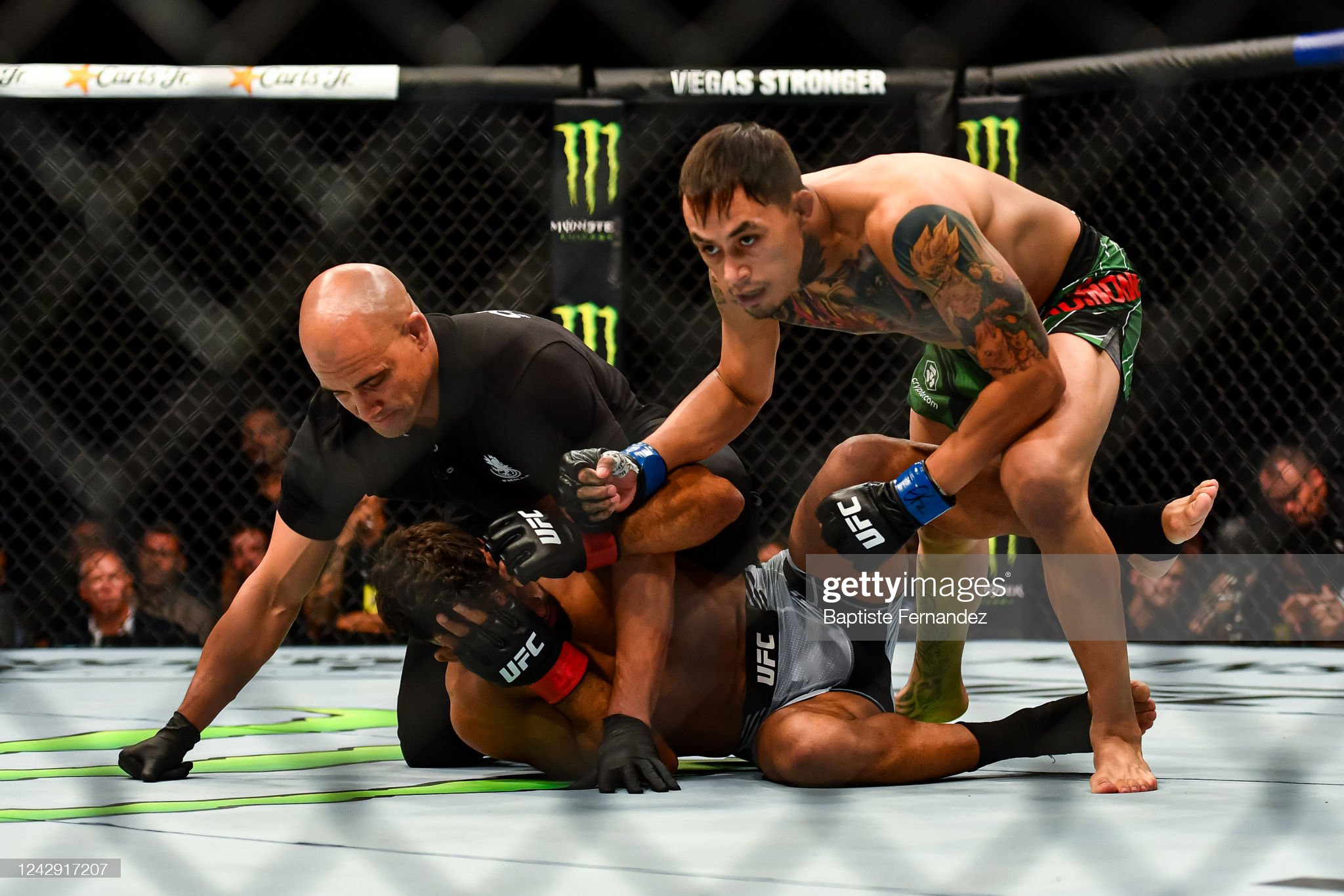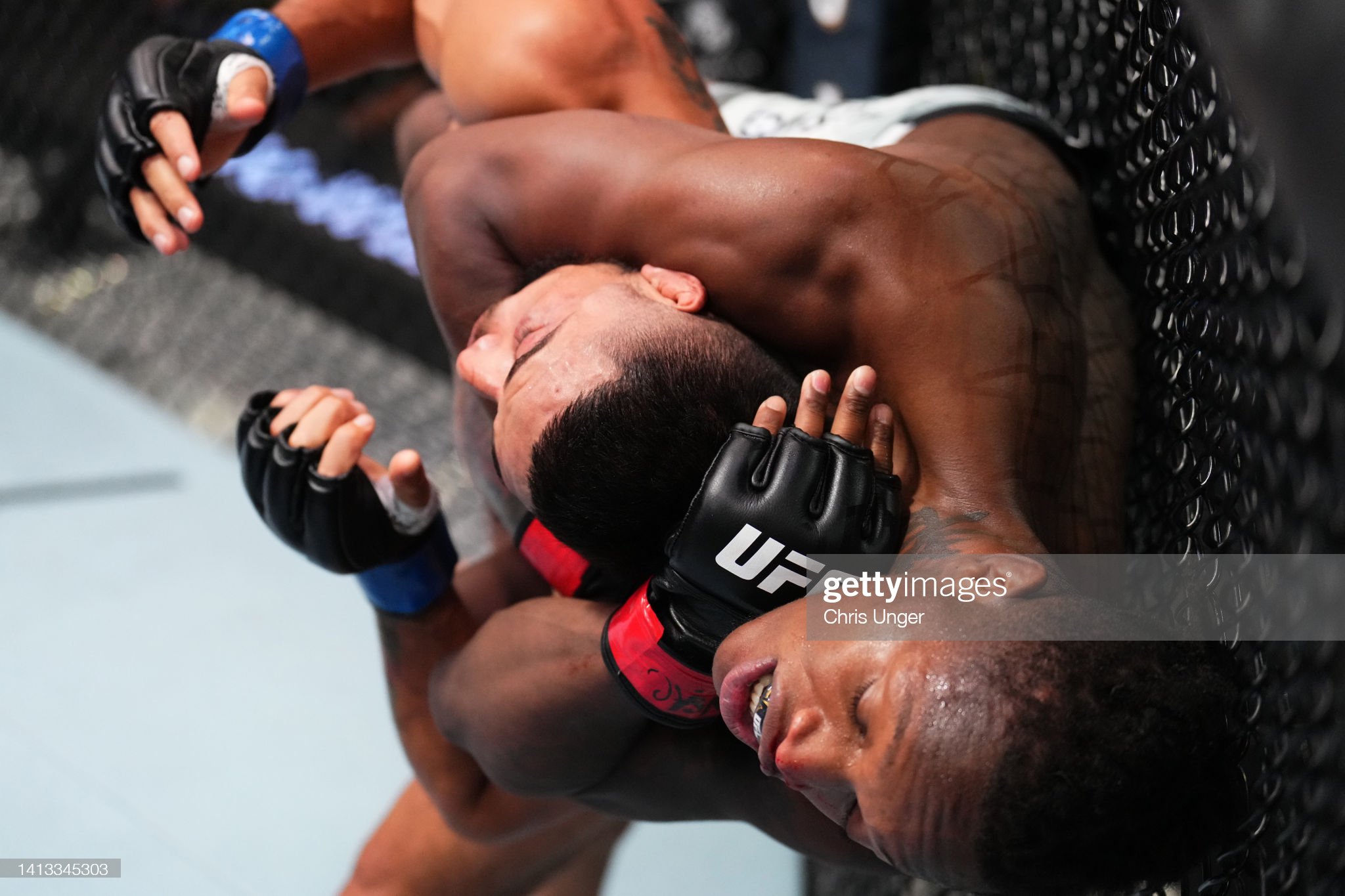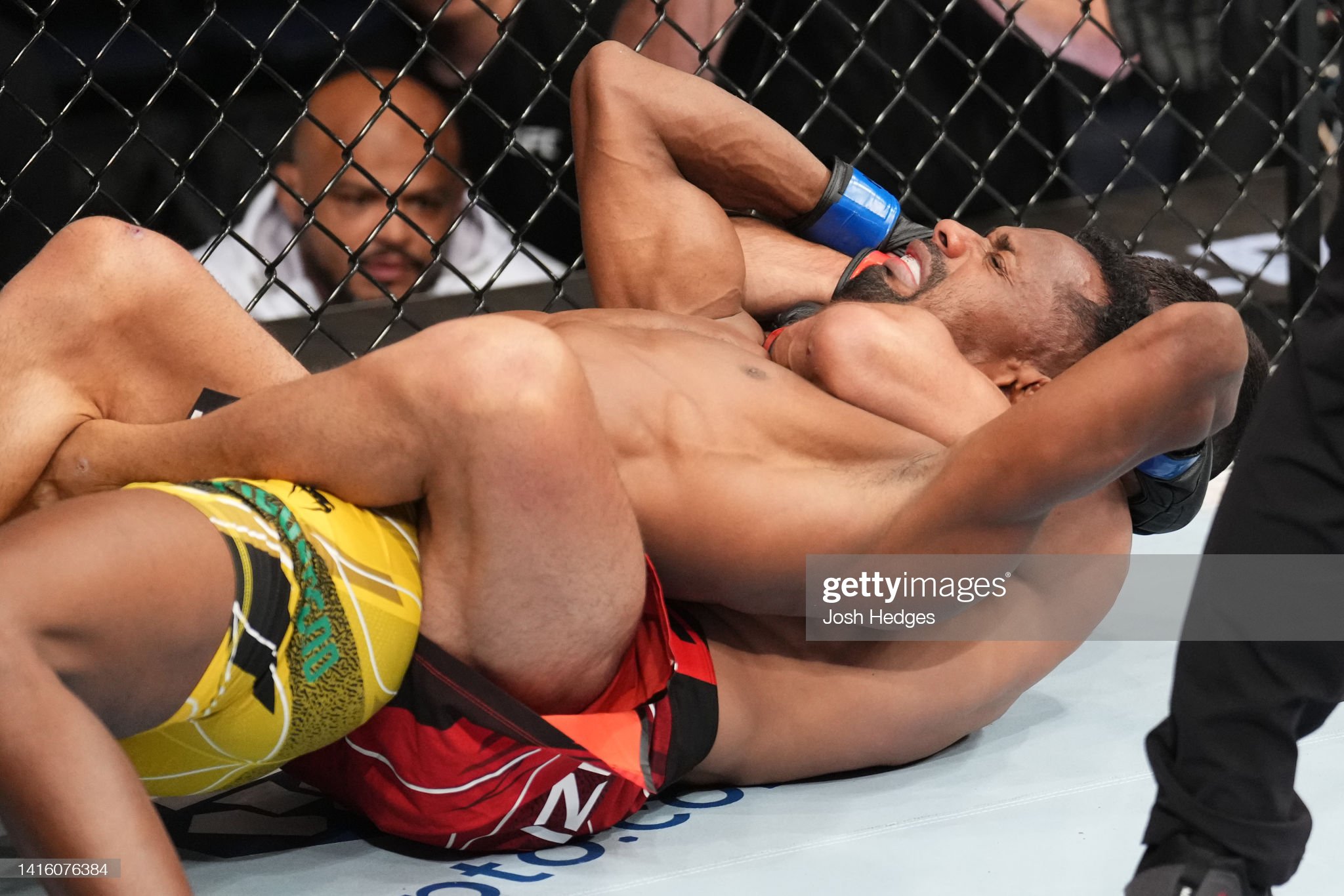[예거가 페레즈의 목에 초크를 시도하고 있다]