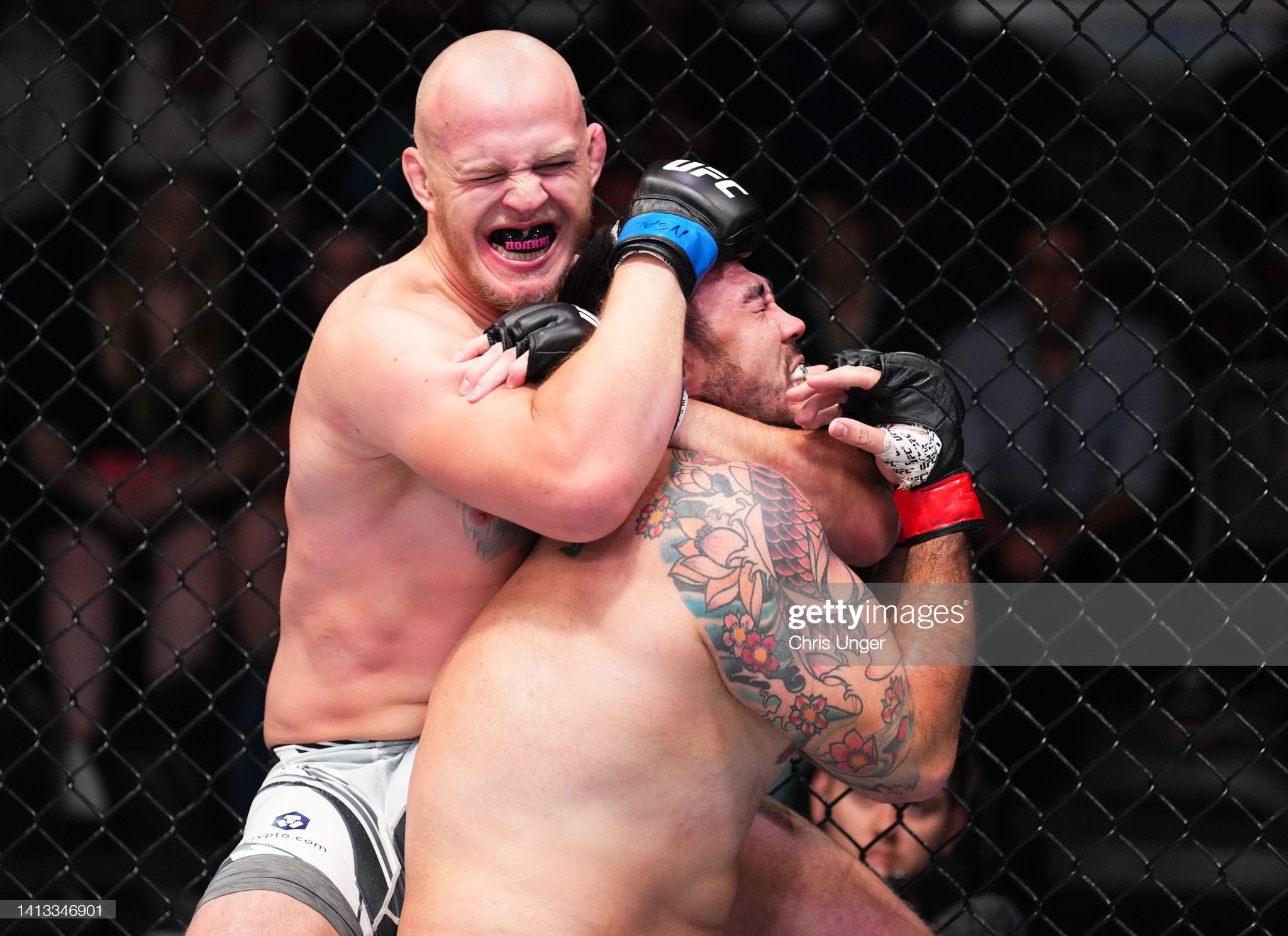 [올렉셰이척에 오버 언더 훅에 다운된 엘베이를 덥치고 있다]