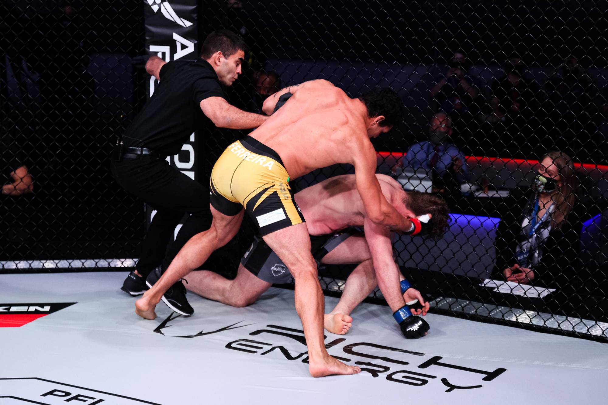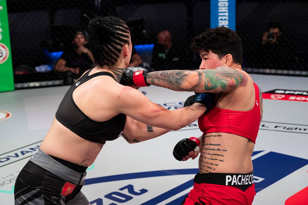 한 방이 있는 타격가 프리쉴라 카초에이라(32, 브라질)는 TKO로 연패 탈출 후 단체 첫 연승행진을 시작했다. 지나 마자니(32, 미국)의 연달은 테이크 다운에 두 번째 라운드 중반까지 끌려다니며 무력하기 그지 없는 경기를 펼쳤으나, 하위에서의 엘보로 컷을 만들며 기회를 노렸다. 상위의 마자니의 움직임이 줄자, 레프리 벨트런이 스탠딩을 선언, 일어날 수 있어던 카초에이라가 지친 상대를 펀치 러쉬로 압박, 2R 종료 9초를 남기고 스탠딩 TKO승을 이끌어냈다.