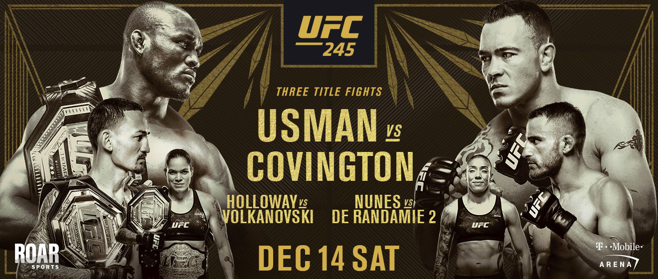 [UFC 245 'Usman vs Covington' 결과] 13경기: 카마루 우스만 > 콜비 코빙턴 (TKO 5R 4:10) * 웰터급 타이틀 전 12경기: 맥스 할로웨이 < 알렉산더 볼카노프스키 (판정 0-3) * 페더급 타이틀 전 11경기: 아만다 누네즈 > 저메인 드 란다미 (판정 0-3) * 女 밴텀급 타이틀 전 10경기: 말론 모라에스 > 조제 알도 (판정 2-1) 09경기: 페트르 얀 > 유라이어 페이버 (TKO 3R 0:53) 08경기: 제프 닐 > 마이크 페리 (TKO 1R 1:30) 07경기: 케틀렌 비에이라 > 이레네 알다나 (TKO 1R 4:51) 06경기: 이안 하이니쉬 < 오마리 아크메도프 (판정 0-3) 05경기: 맷 브라운 > 밴 사운더스 (TKO 1R 4:55) 04경기: 체이스 후퍼 > 다니엘 테이머 (TKO 1R 4:34) 03경기: 브랜던 모레노 > 카이 카라 프랑스 (판정 3-0) 02경기: 제시카 아이 > 비비아네 아라우주 (판정 2-1) * 59.42kg 계약 01경기: 푸나헬레 소리아노 > 오스카 피오타 (KO 1R 3:17)