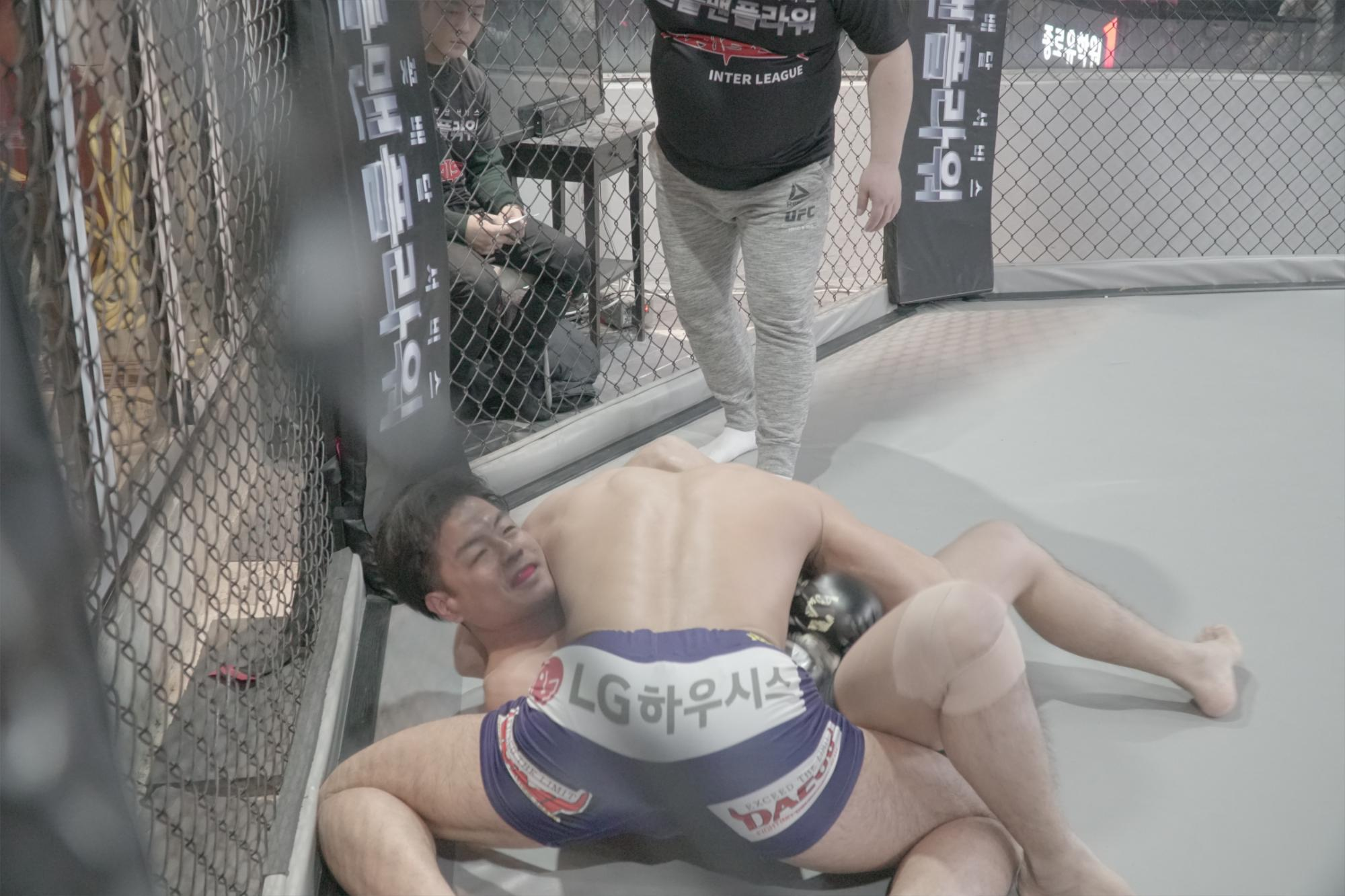 [임승헌이 아라가키와 클린치 싸움을 벌이고 있다]