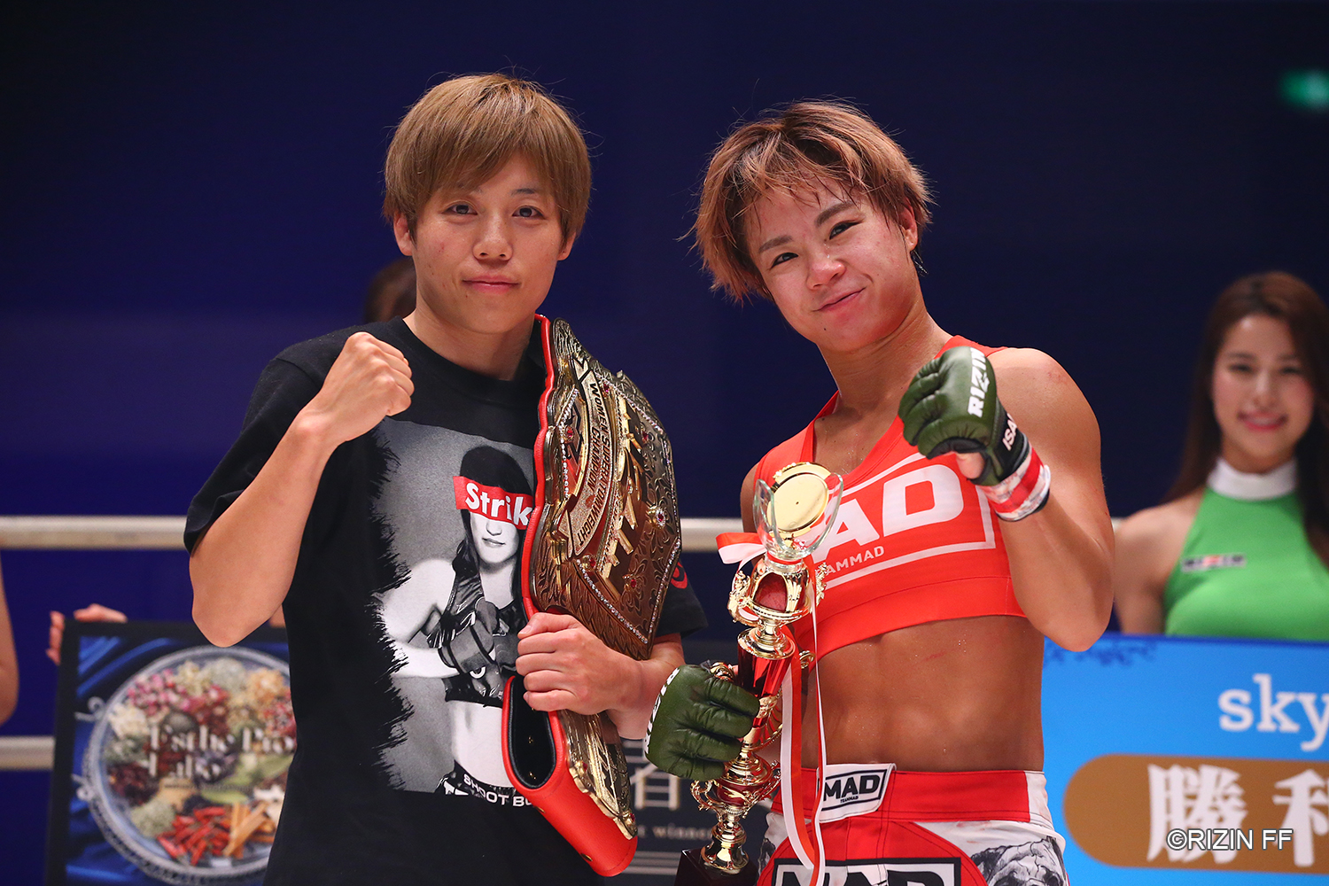 이날 아톰급(48kg) 타이틀 전에서는 라이진에서 함서희에게 패한 타이틀 홀더 마에사와 토모(31, 일본)가 약 2년전 패배를 안겨 줬던 베테랑이자 전 챔피언 토모마츠 에미(37, 일본)를 판정으로 잡아내고 타이틀을 수성, 리벤지와 벨트 방어의 두 마리 토끼를 잡아냈다.