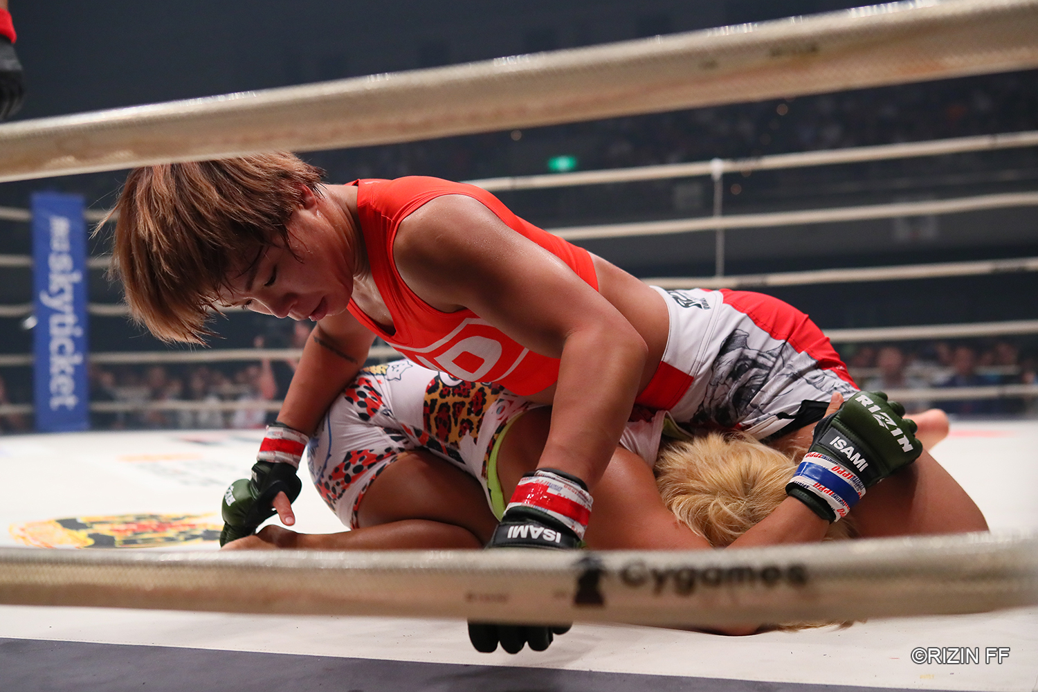 [나카무라가 넘어진 소우자를 상대로 파운딩 공방을 벌이고 있다]
