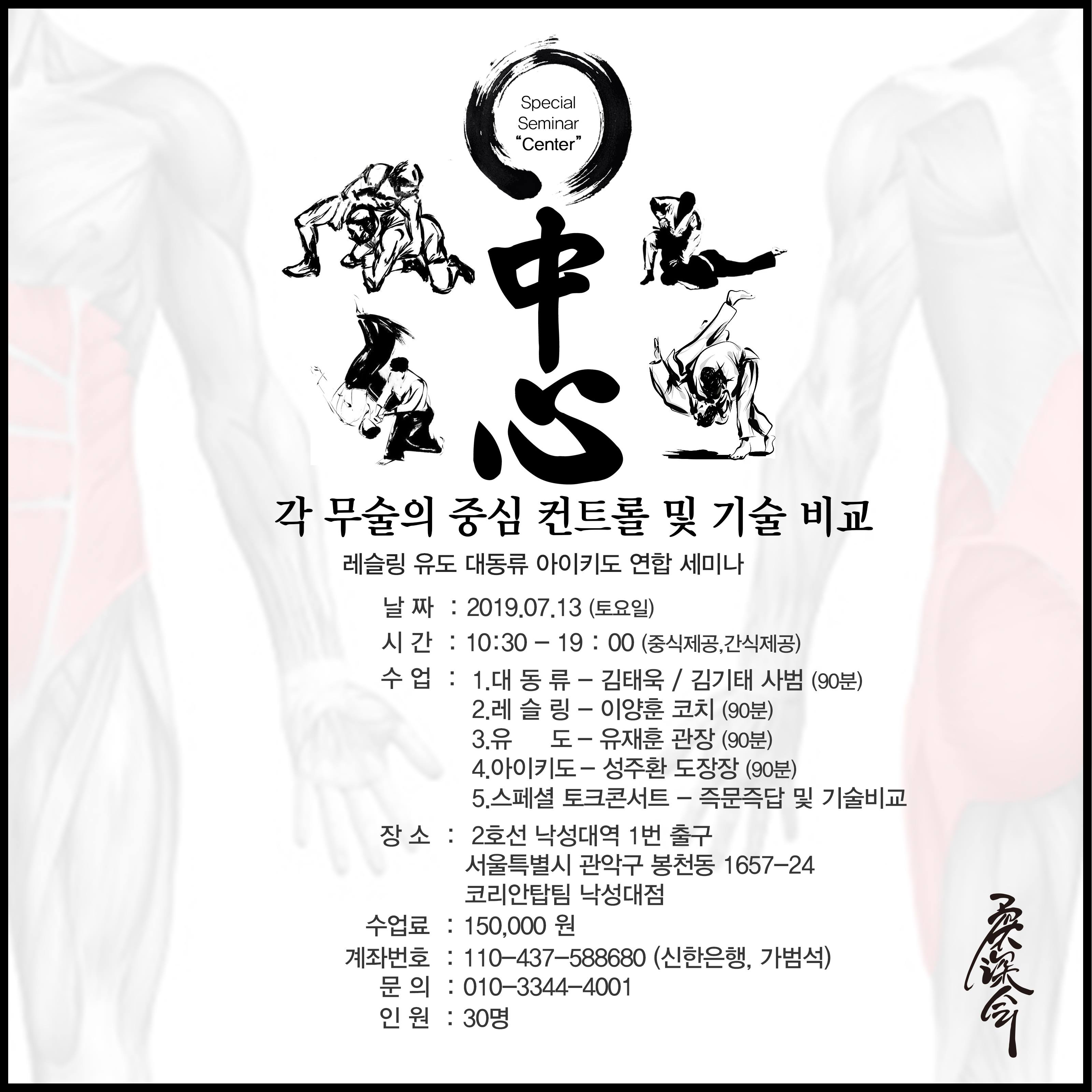 레슬링, 유도, 대동류합기유술, 아이키도의 콜라보 세미나 개최 < 각 무술의 중심 컨트롤 및 기술 비교 세미나 > 7월 13일에 열려