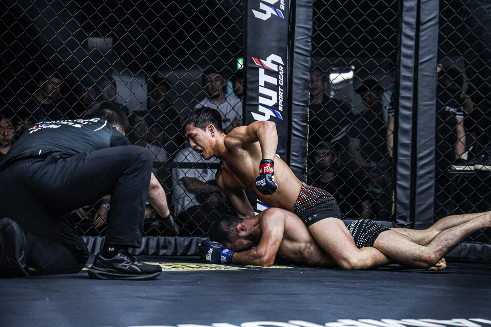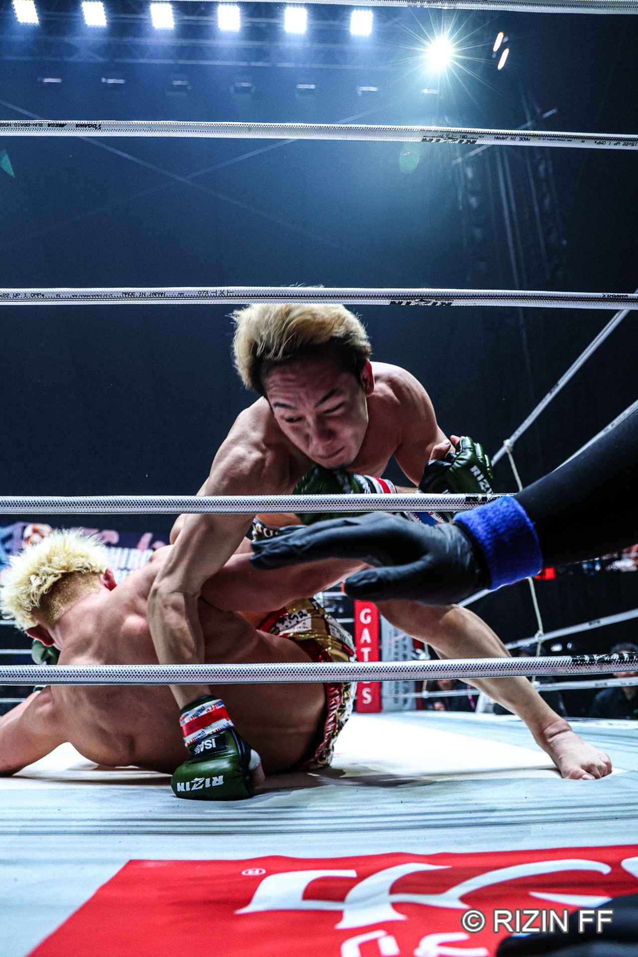 [레프리가 지켜보는 가운데 아사쿠라의 파운딩을 피하는 스즈키]