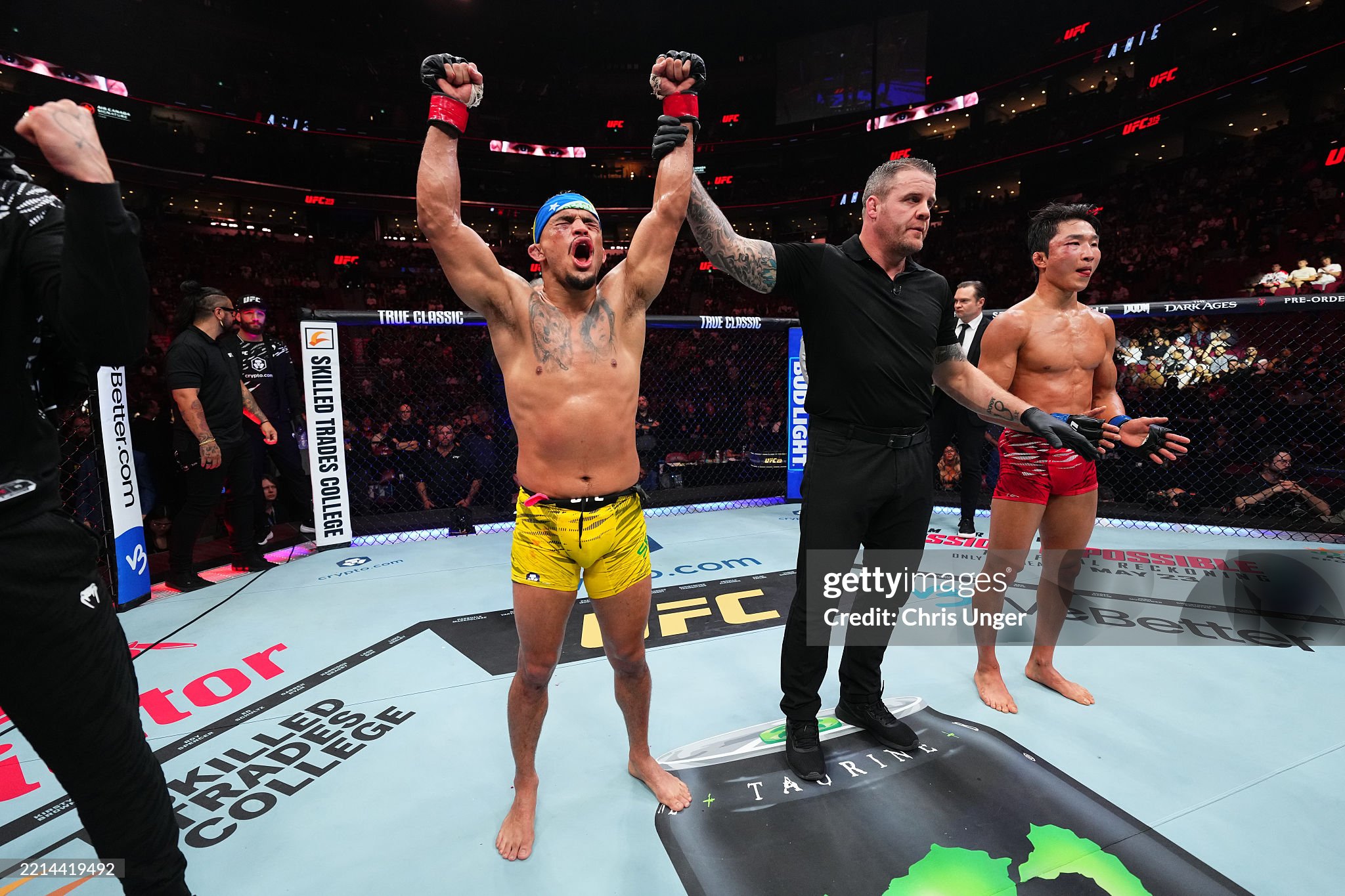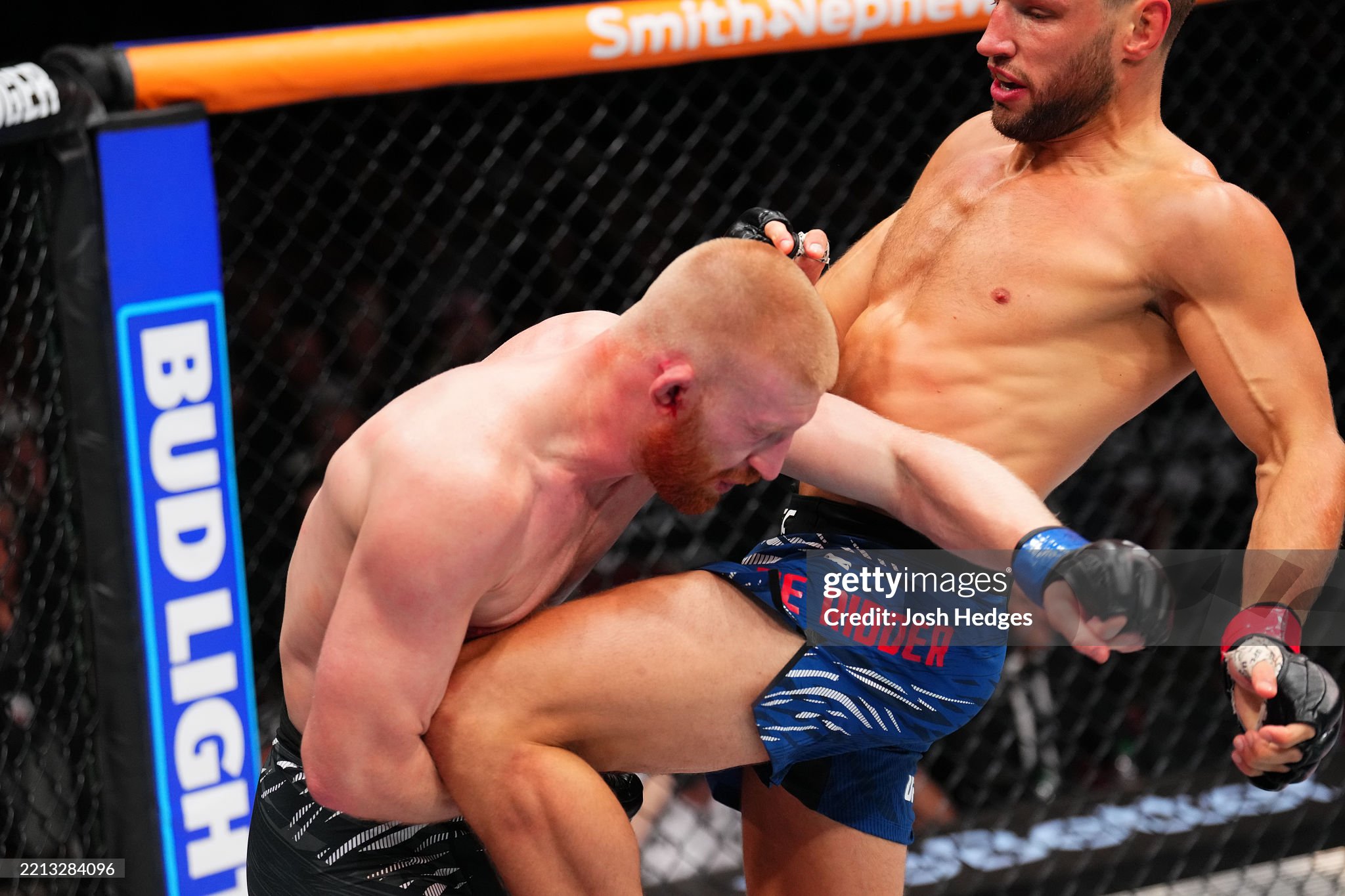2연패로 주춤했던 라이트급 13위 랭커 베누아 생 드니(29, 프랑스)는 급오퍼로 UFC에 복귀한 카일 프레폴렉(35, 캐나다)을 서브미션으로 잡아냈다. 초반부터 테이크 다운을 시도한 생 드니는 일찌감치 테이크 다운을 성공 첫 라운드 내내 초크와 상대의 백에서 시간을 보내며 압도적인 그라운드를 피력했다. 2R 초반 프레폴렉에게 클린 히트를 내줬지만 클린치로 붙은 생 드니가 엘보와 니로 데미지를 안겼고 백에서 다시금 상대를 테이크 다운시킨 생 드니가 곧바로 암 트라이앵글을 캐치, 탭을 이끌어냈다.