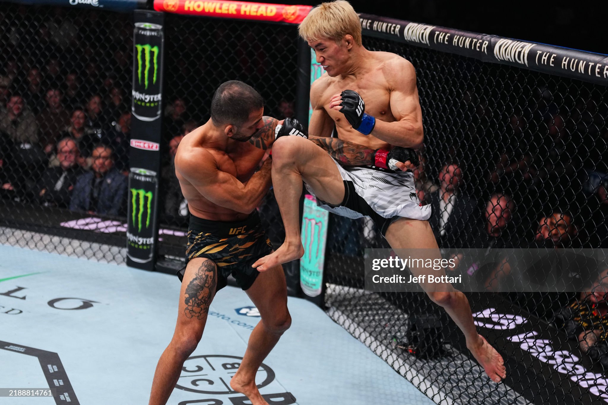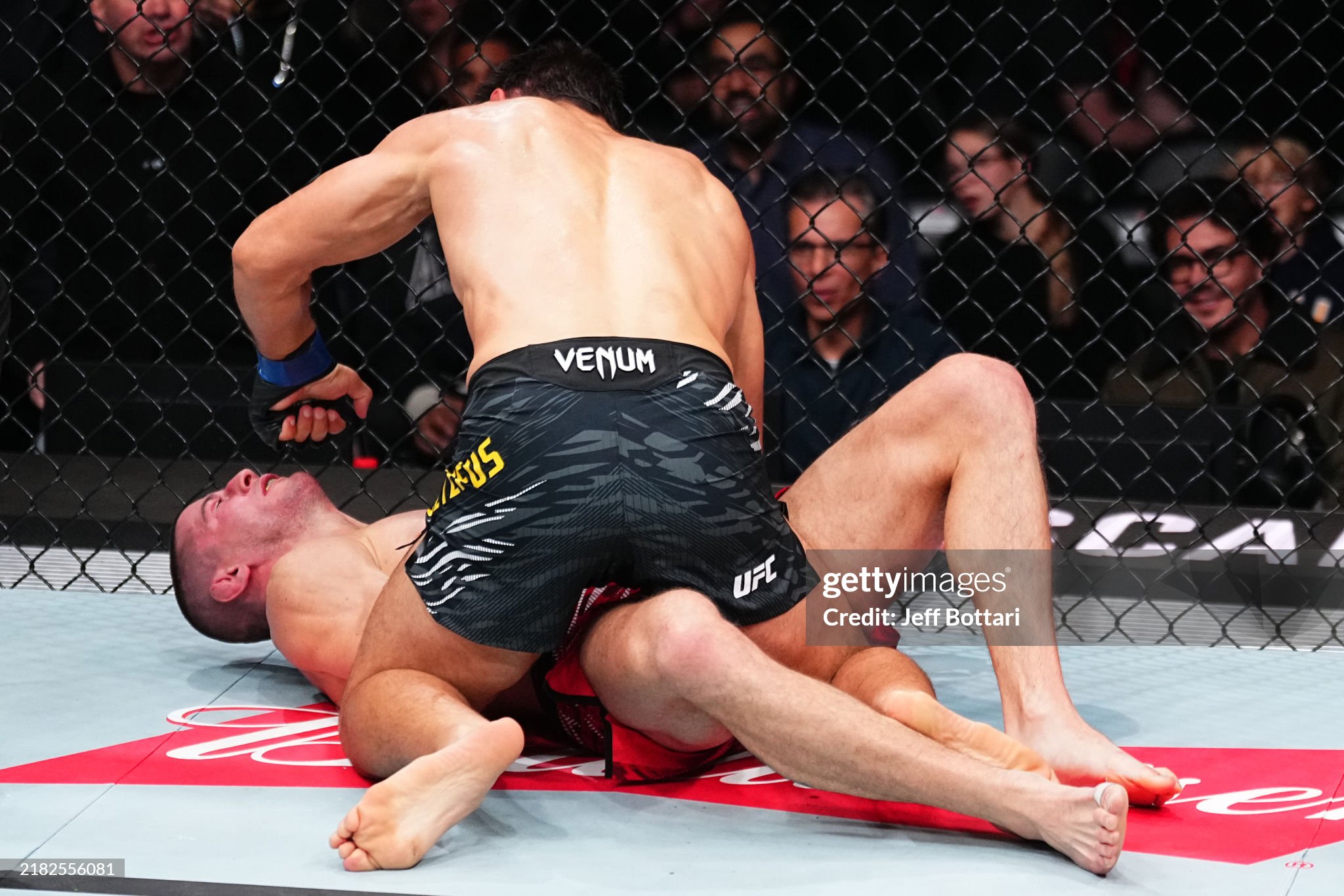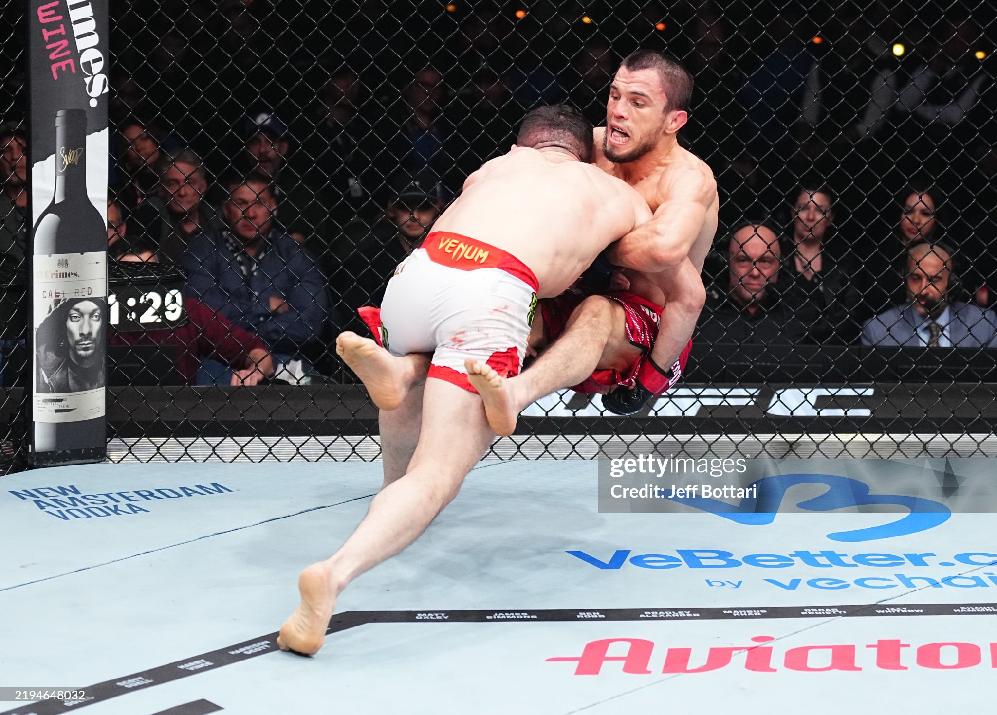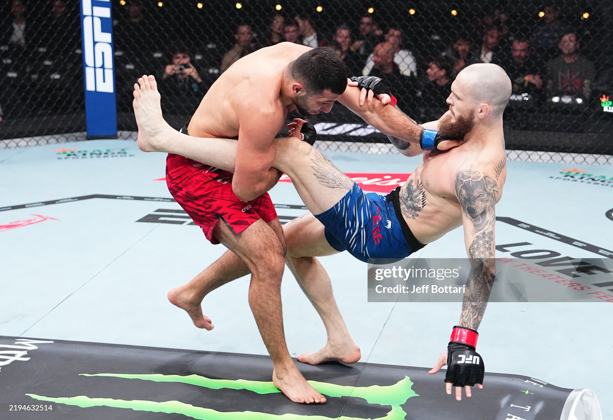 긴급 오퍼를 받고 들어온 라이트헤비급 13위 보그단 구스코프( 32, 우즈베키스탄)는 PFL 리거로 3연승 중이던 빌리 엘레카나(29, 미국)를 서브미션으로 격파했다. 1R 초반, 싱글 렉 태클에 테이크 다운을 허용하며 불안한 스타트를 끊었던 구스코프는 1R 상당시간 컨트롤 당했으나 막판 스윕 후 백 초크로, 흐름을 내주지 않았다. 2R 중반 타격에 몰리며 케이지를 등지기 시작한 엘레카나가 눈을 만지자 압박을 시작한 구스코프가 바디샷 후 압박 끝에 길로틴으로 탭을 받아낼 수 있었다.