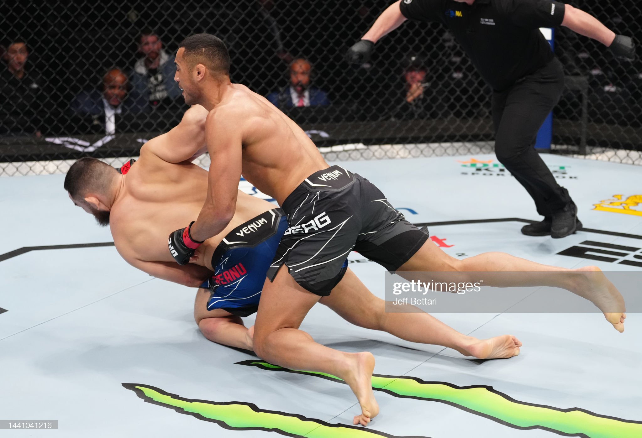밴텀급 15위 사이드 누르마고메도프(30, 러시아)는 카운터 서브미션으로 4연승을 이어가게 됐다. 단체 진출 후 3연승을 노리던 사이디오쿱 카흐라모노프(27, 우즈베키스탄)과의 초반 클린치 싸움에 길로틴으로 먼저 선수를 쳤던 누르마고메도프는 이후 상대의 백 클린치 등 뛰어난 레슬링에 크게 애를 먹어야 했다. 그러나 2R 후반 싱글 렉을 쳐오는 상대에 누르마고메도프가 다스 그립으로 목을 잡기 시작, 스크램블 끝에 돌아나가는 상대에 길로틴으로 탭을 냈다.
