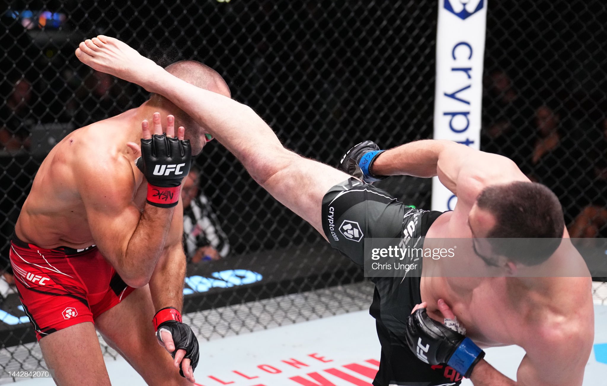 엘리트 주지떼로로 두 개 단체의 타이트 홀더인 플라이급 8위 아미르 알바지(28, 이라크)는 대타로 UFC 데뷔 전에 나선 7연승의 기대주 알렉산드로 코스타(26, 브라질)에 한판 승을 거두고 단체 무패를 이어갔다. 알바지는 타이트한 타격 압박의 1R 후, 스트레이트 두 방에 다운된 상대를 눌러 2R까지 가져갔다. 3R 초반에도 서두는 상대에 카운터 테이크 다운을 뽑는 등 여유를 가져간 알바지는 스트레이트에 올라간 상대의 가드를 훑는 듯한 라이트 어퍼와 파운딩으로 매치를 종결지었다.