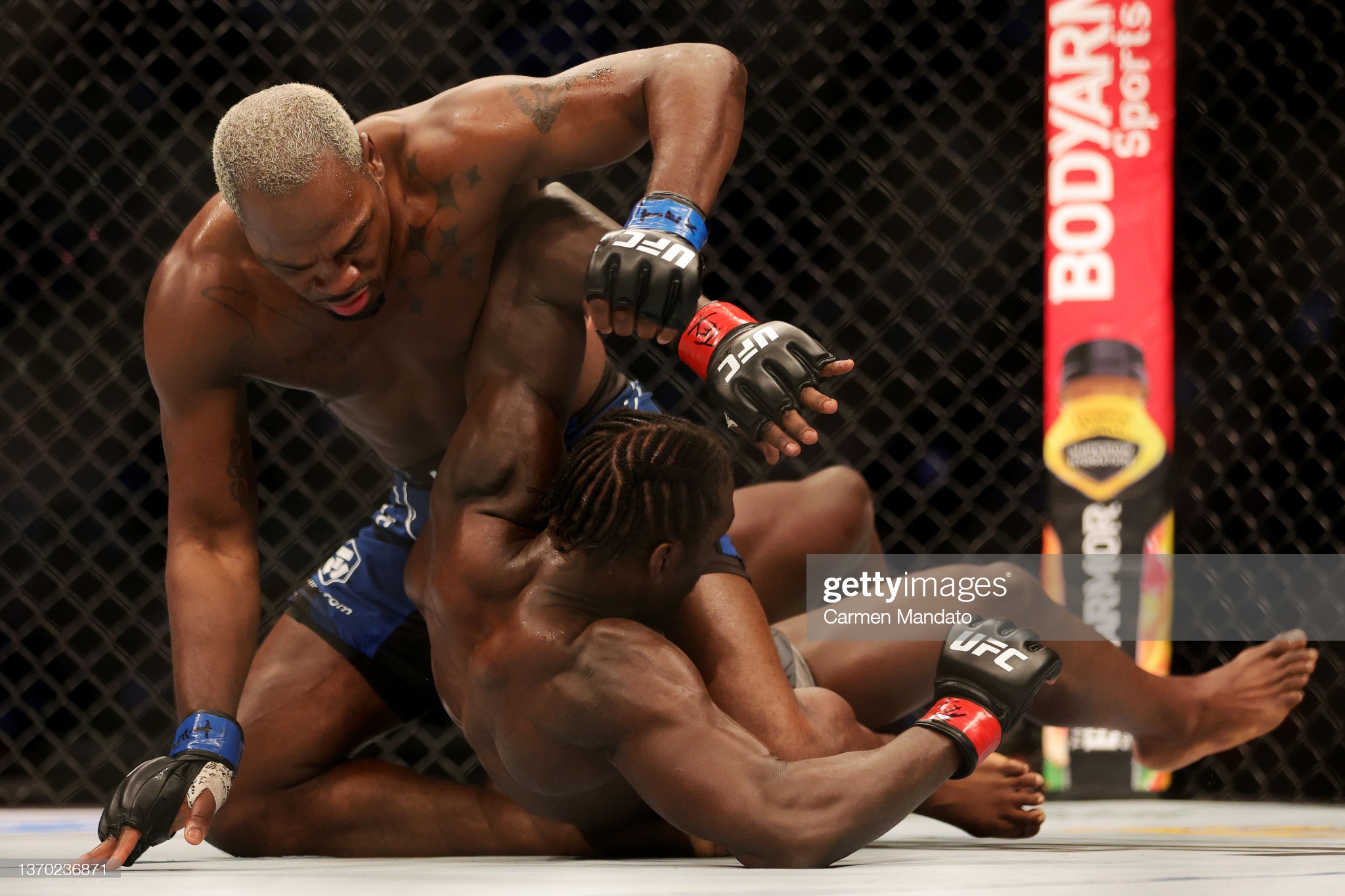 라이트급 13위 아루마 사루키안(25, 아르매니아)은 피니쉬율 100%로 마찬가지로 4연승 중이던 강호 조엘 알바레즈(28, 스페인)를 TKO로 제압, 10위권 진입을 눈 앞에 두게됐다. 초반 테이크 다운 후, 진득한 압박을 이어가던 사루키안은 손목 컨트롤 하느라 비어있던 상대의 안면을 엘보로 긁어 대량 출혈을 유발하며 1R을 마쳤다. 2R 초반에도 카운터 태클로 상위를 차지한 알바레즈는 크루시픽스에서의 엘보, 테이트 다운 추가로 상대를 괴롭히다 파운딩으로 스탑을 받아냈다.
