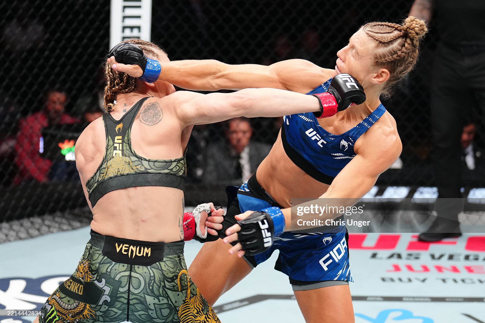 여성 현 플라이급 타이틀 홀더 발렌티나 쉐브첸코(37, 키르키즈스탄) 5위 마농 피오르(35, 프랑스)를 사우스포에서의 압도적인 앞손과 킥 캐치의 테이크 다운과 상위 압박으로 첫 라운드를 가져간 쉐브첸코는 더블 렉에 한 차례 테이크 다운을 내준 2라운드 이후 본격적으로 테이크 다운을 들고나오기 시작한 상대의 레슬링에 애를 먹었다. 그러나 틈을 놓치지 않은 앞손 더블에 다운을 빼앗아 4R을 가져간 쉐브첸코는 뒷손 스트레이트와 백 스핀, 수퍼맨 펀치 등으로 5R을 차지, 판정으로 벨트로 지켜냈다.