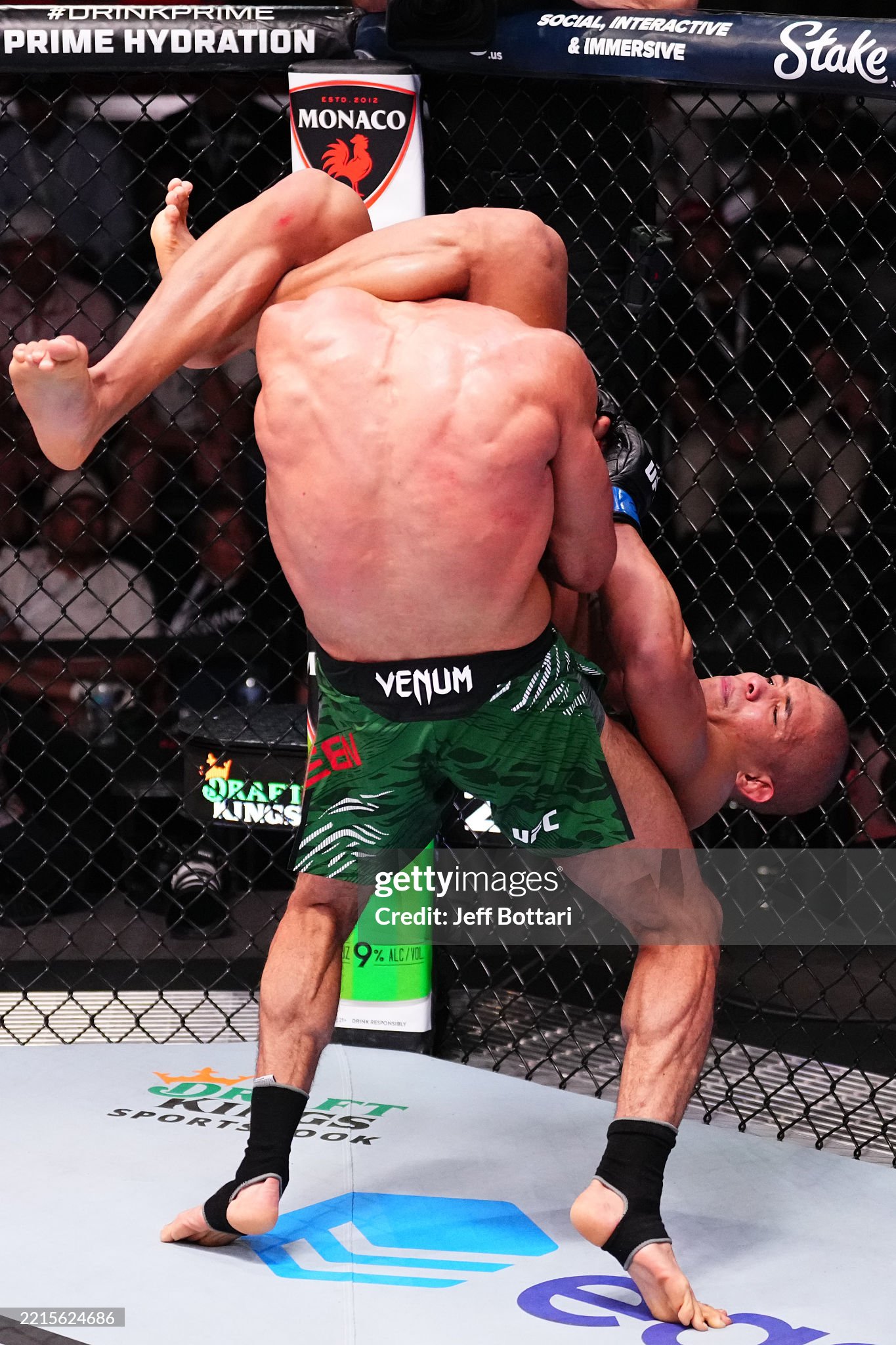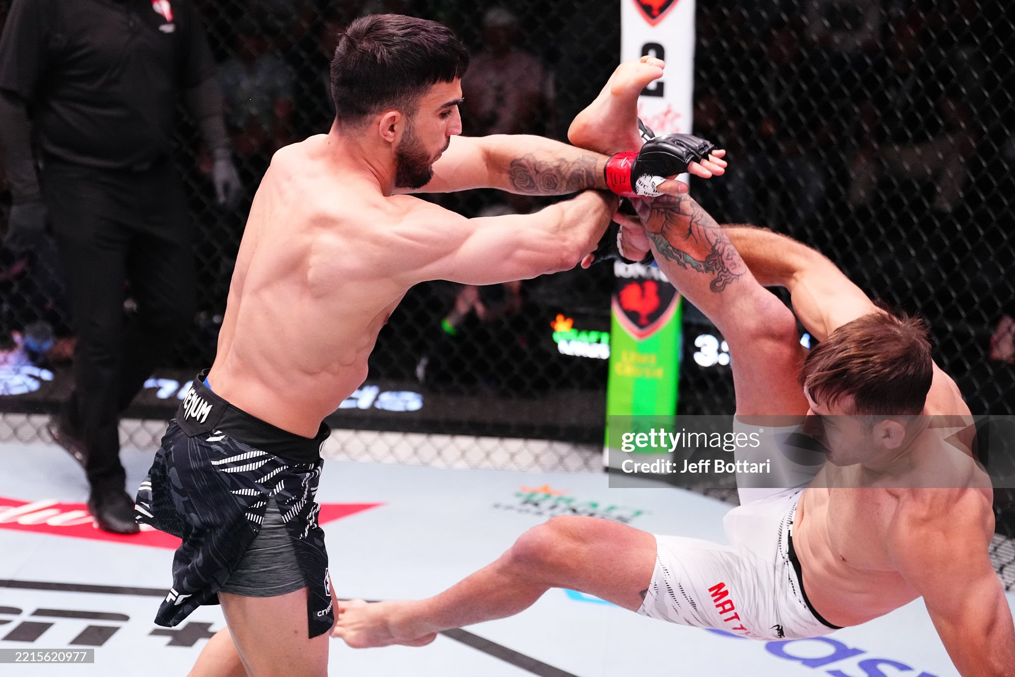 [델 발리에가 캐치한 발을 들어올려 매튜스를 무너뜨리고 있다]