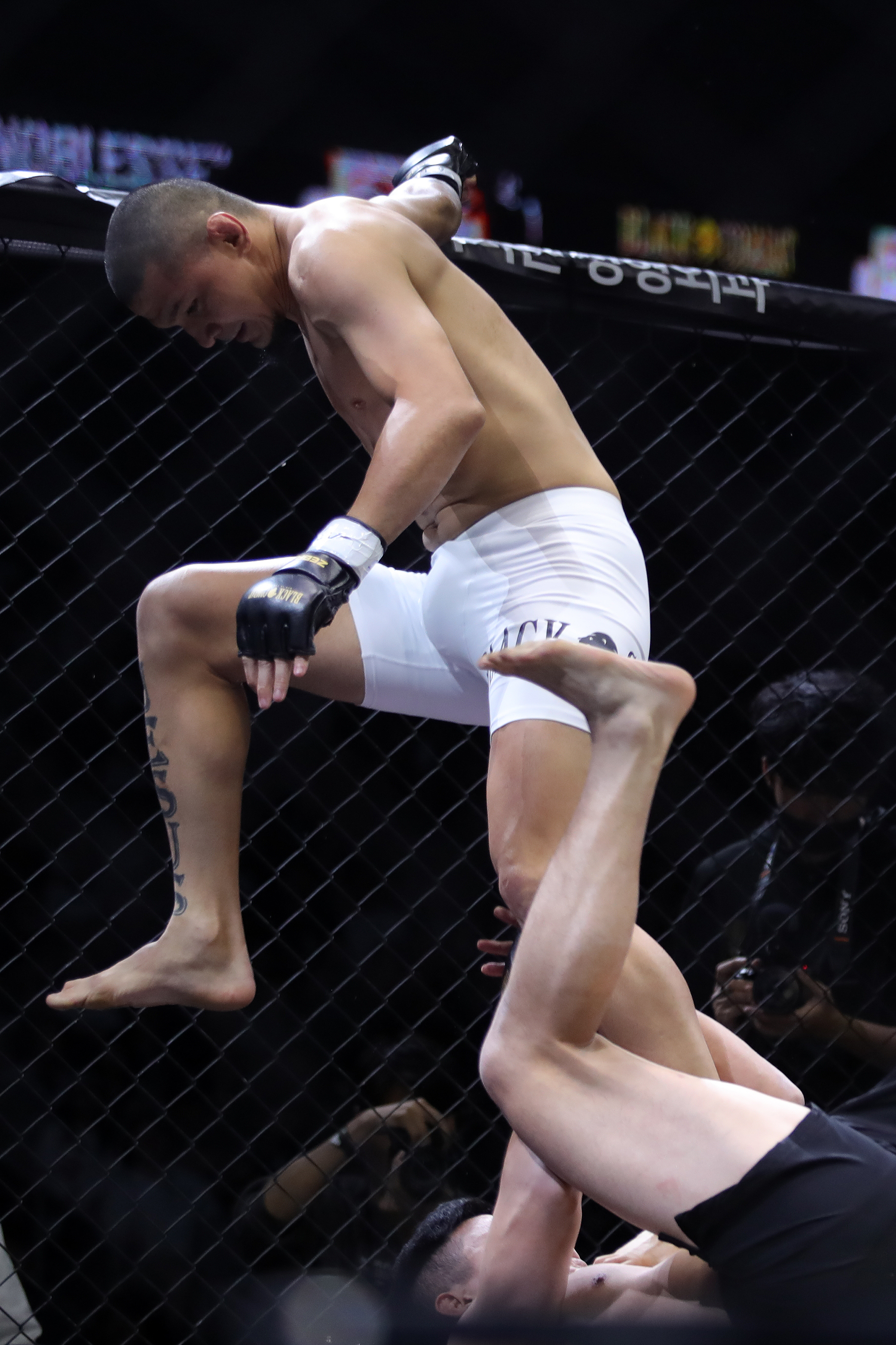 [레프리가 지켜보는 가운데 아사쿠라의 파운딩을 피하는 스즈키]