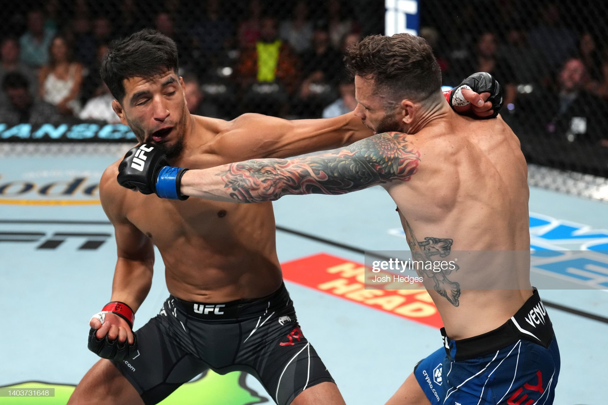페더급 7위 조쉬 에맷(37, 미국)은 격전 끝에 판정승을 거두고 타이틀을 한 걸음 더 가까이 두게 됐다. 페더급 4위 켈빈 케이터(34, 미국)는 정통파 복싱의 잽에 경기 내내 시달려야 했던 에멧은 최종 유효타가 20대 가까이 뒤진데다 4R 스피닝 엘보와 카운터 원투로 균형까지 흔들렸으나, 그 와중에도 케이터의 눈 밑을 붓게 만드는 훅 카운터 등을 꾸준히 넣으며 추적했다. 경기 종료 후 48-47, 47-48, 48-47로 에맷이 승리를 가져갔다.