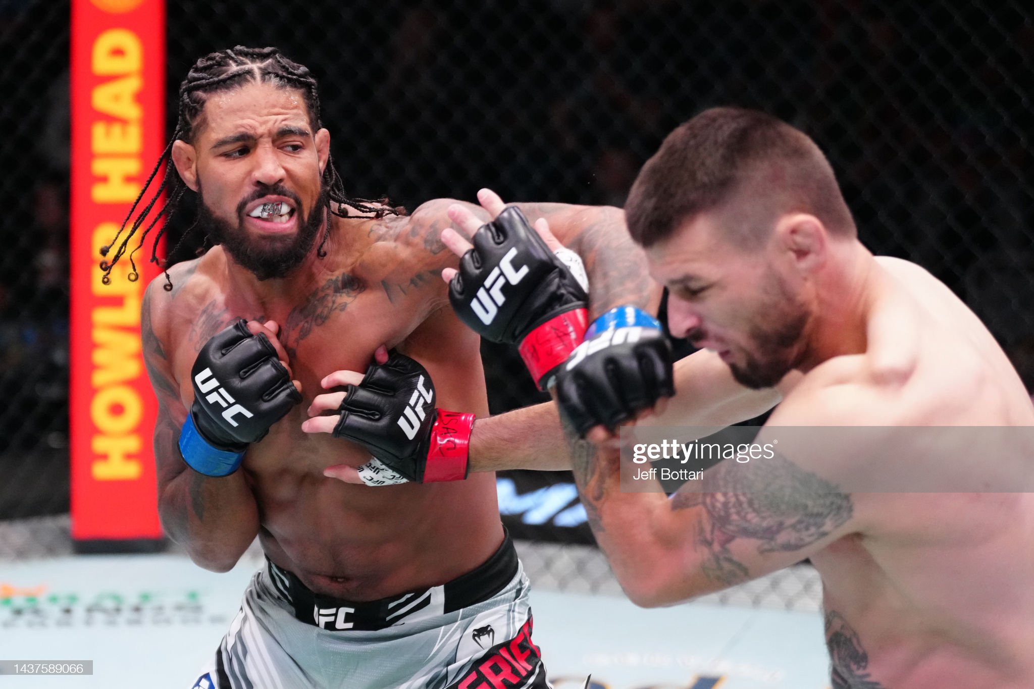 TUF 29 리거 트레션 고어(28, 미국)는 근사한 카운터 서브미션으로 장신 조쉬 프램드(28, 미국)를 제압, 단체 입성 후 첫 승을 일궈냈다. 슬램 등을 피로했지만, 스태미너 저하로 지쳐가던 고어는 2R 플라잉 니 킥에 밀려 케이지 벽에 등을 대야 했다. 허나, 곧바로 싱글 렉을 쳐오는 프램드의 턱 밑으로 고어가 팔뚝을 집어넣어 길로틴을 시도했고, 위험함을 느낀 프램드가 케이지를 밟고 탈출을 시도했으나 고어가 그대로 초크를 굳혀 프램드를 재워버렸다.