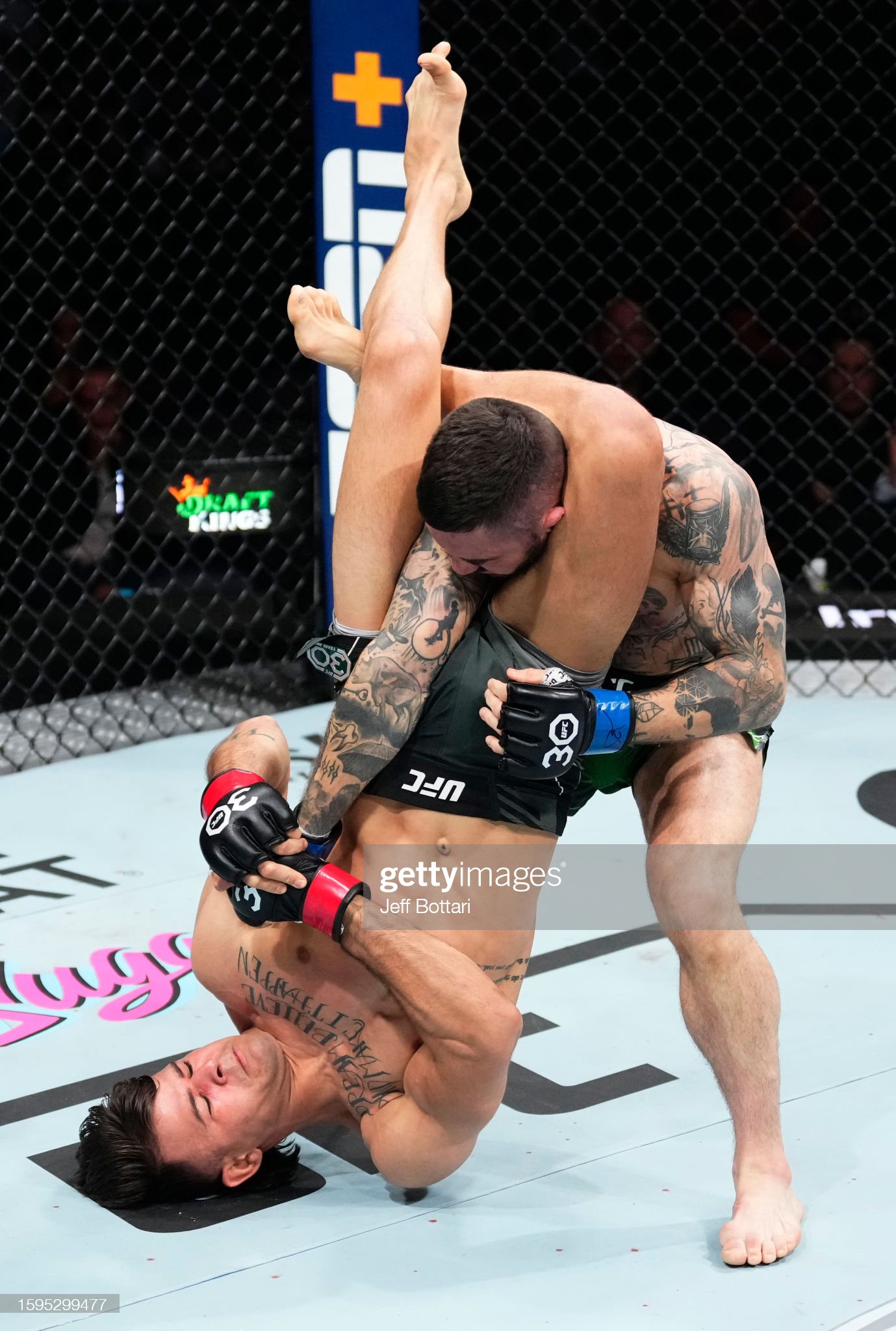UFC 데뷔 전에서 다채로운 서브미션 기술로 패하고도 보너스와 더블 파이트 머니를 받아냈던 디에고 로페즈(28, 브라질)최승우를 초크로 잡아 낸 게빈 터커(37, 캐나다)를 서브미션으로 잡아내고 단체 내 첫 승을 기록했다. 시작하자마자 로우킥에 금적을 얻어맞은 로페즈는 회복 후 싱글렉을 쳐오는 상대에 플라잉 트라이앵글을 캐치했다. 삼각이 얕아보였으나, 삐져나온 터커의 팔을 로페즈가 꺾기 시작, 탭을 받아냈다.