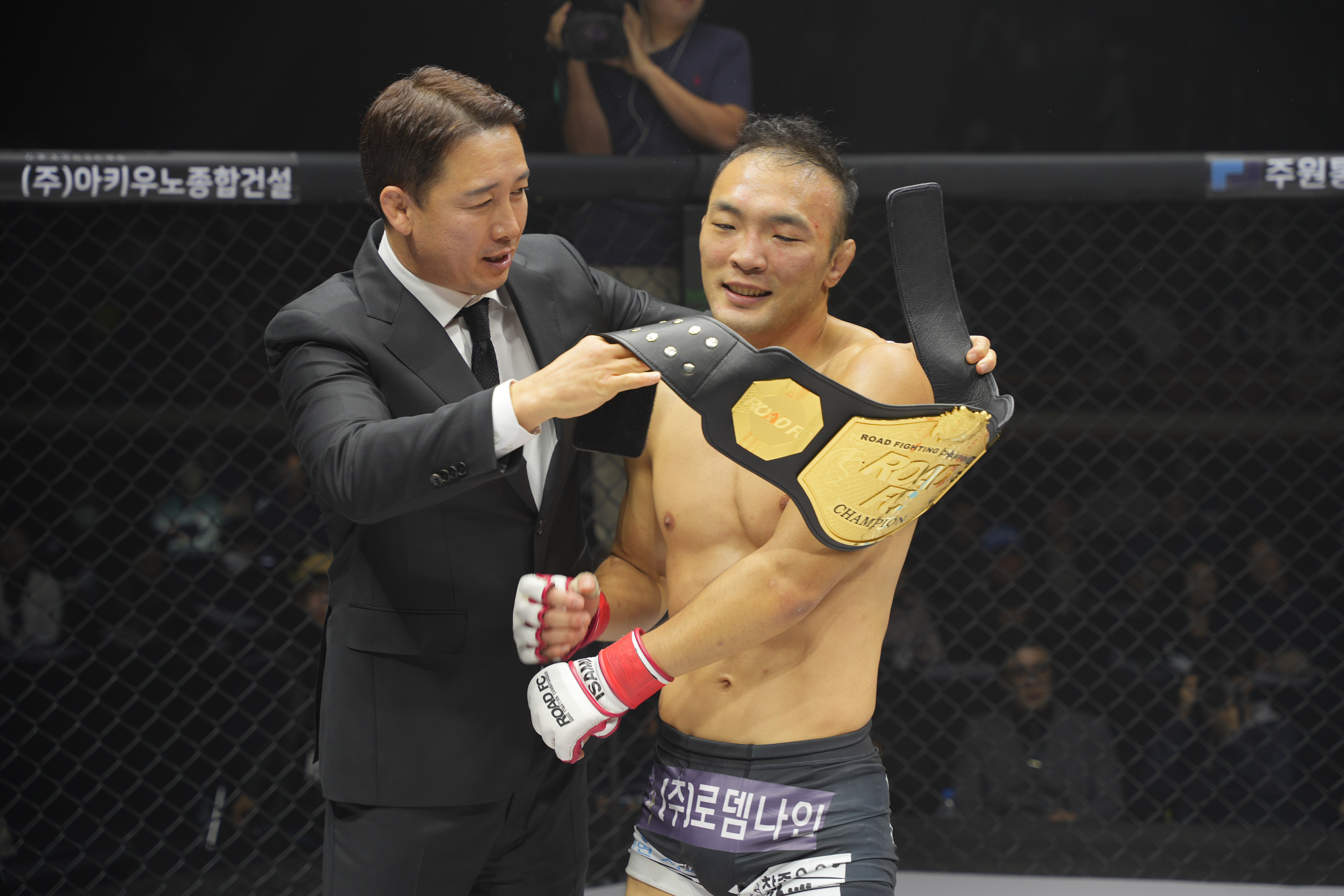 박정은의 팀메이트, 7전8기의 고동혁(26, 팀 스트롱울프)은 서브미션으로 탭을 받아내는 근사한 한판승으로 1승을 추가했다. 3연패 중인 최영찬(18, 로드 FC 군산)의 로그 킥에 카운터 태클로 상대를 케이지 벽으로 돌려낸 고동혁은 상대의 오금과 케이지를 밟고 백을 차지, 초크를 시작했다. 불시에 목을 내준 최영찬이 그립을 뜯어내고 고개를 돌려 초크를 막아보려 애썼으나. 결국 목이 잠겨버린 최영찬이 탭, 고동혁의 승리가 확장됐다.