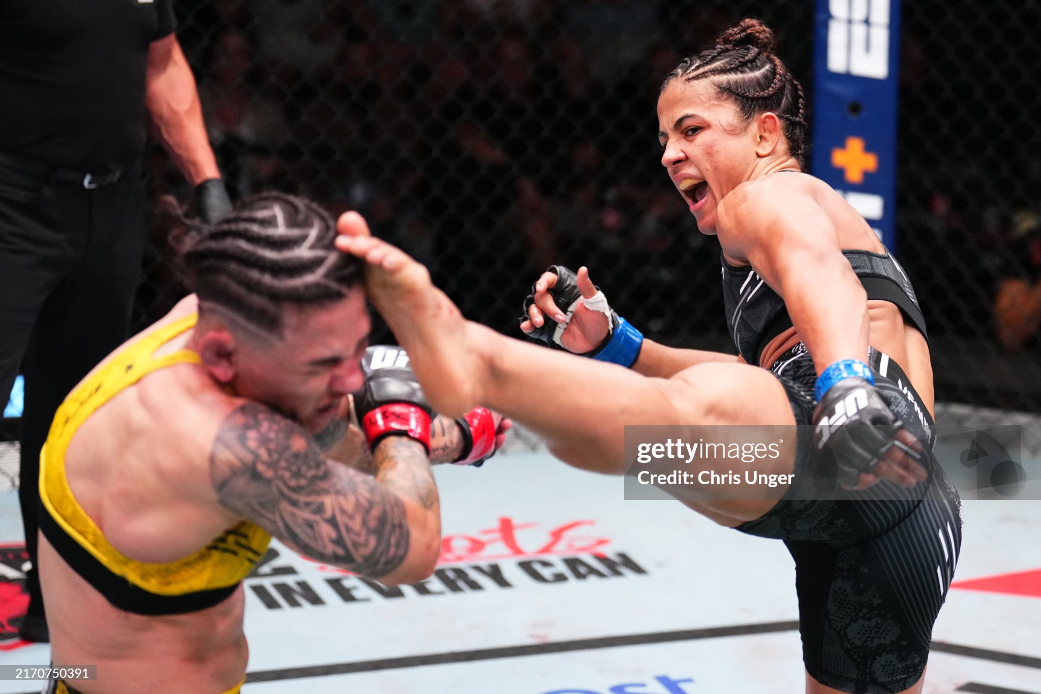 8위의 태권도 베이스의 스트라이커 나탈리아 시우바(27, 브라질)는 스트로급 여왕 출신의 6위 제시카 안드라지(32, 브라질)로부터 판정승을 챙겼다. 스피드와 피지컬 우위를 바탕으로 사이드 스탭을 깔은 타격을 가지고 나온 시우바는 1R은 사이드 킥으로 플래쉬 다운을, 2R에서는 눈을 맞춘 훅으로 큰 인상을 남겼다. 3R에는 로우킥과 내려차기의 콤보, 한 차례 테이크 다운을 성공시켰다. 안드라지는 1R 수퍼맨 펀치, 훅을 수차례 히트시켰지만 저지의 마음을 돌리기 역부족이었다.