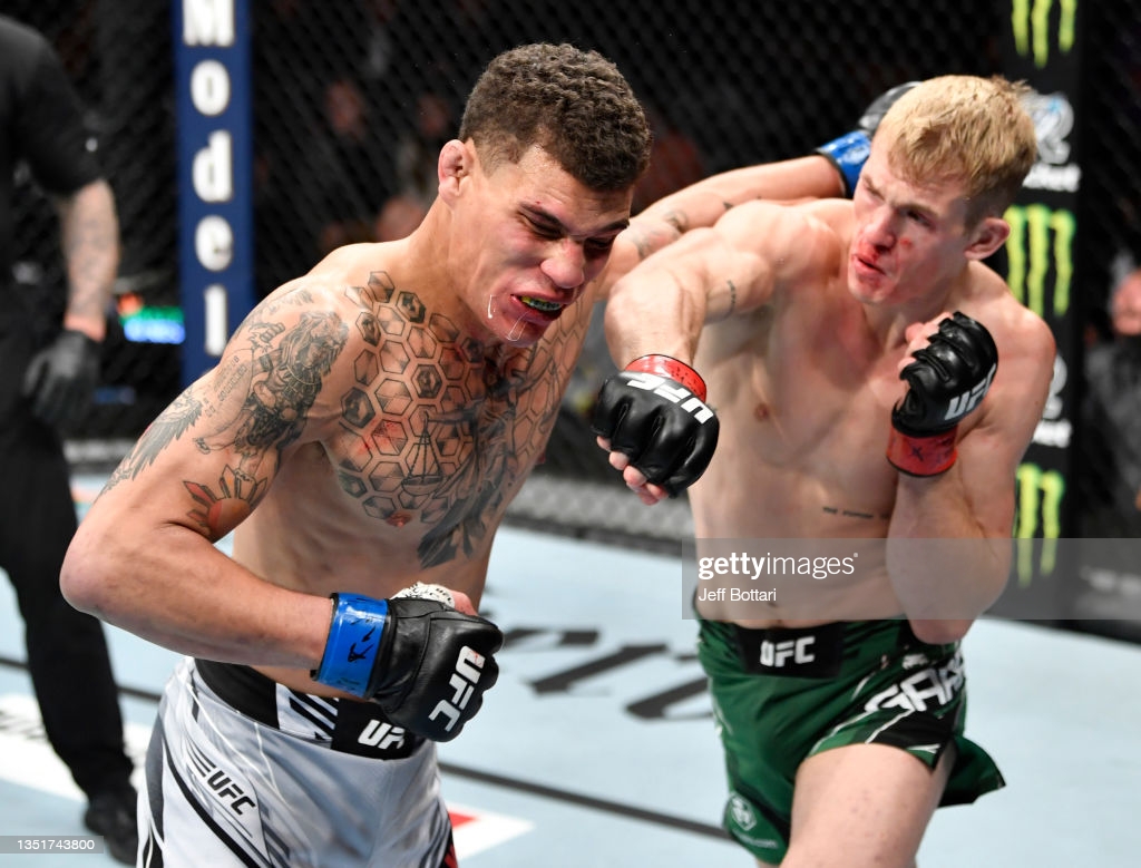 밴텀급 5위 말론 베라(29, 에쿠아도르) 역전 KO로 전 챔프이자 8위 도미닉 크루즈(37, 미국)의 복귀 전을 망쳐 버렸다. 1R 로우킥 카운터로 펀치 플래쉬 다운을 만들긴 했지만 크루즈 특유의 풋워크를 살린 볼륨 타격과 테이크 다운에 끌려다니기 바빴던 베라는 3R, 풋워크 중 무릎 데미지를 입은 상대에게 다운을 뽑으며 활로를 찾기시작했다. 결국 4R, 초반에도 다운을 뽑은 베라가 팔을 톡 치자 돌아나가기 위해 숙인 크루즈의 안면을 걷어차 전투불능을 만들어 종지부를 찍었다.