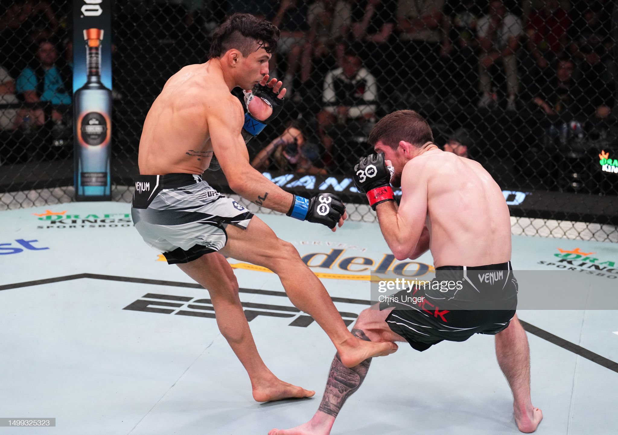 UFC 첫 승을 노리던 컨텐더 리거 알렉산더 코스타(27, 브라질)는 TKO로 단체 입성 후 첫 승을 챙길수 있었다. 단체 두 번째 승리를 노리던 전 벨라토르 리거 겸 LFA 챔프 지미 플릭(32, 미국)과 만난 코스타는 첫 라운드 동안 꾸준히 칼프킥으로 다리에 데미지를 주는데 집중했다. 결국 데미지가 쌓인 플릭이 백스탭을 밟다 부상을 입었고, 플릭의 태클을 스프롤한 코스타가 안면 가드에 체중을 실은 엘보 파운딩을 연사, 레프리의 경기 중지를 이끌어낼 수 있었다.