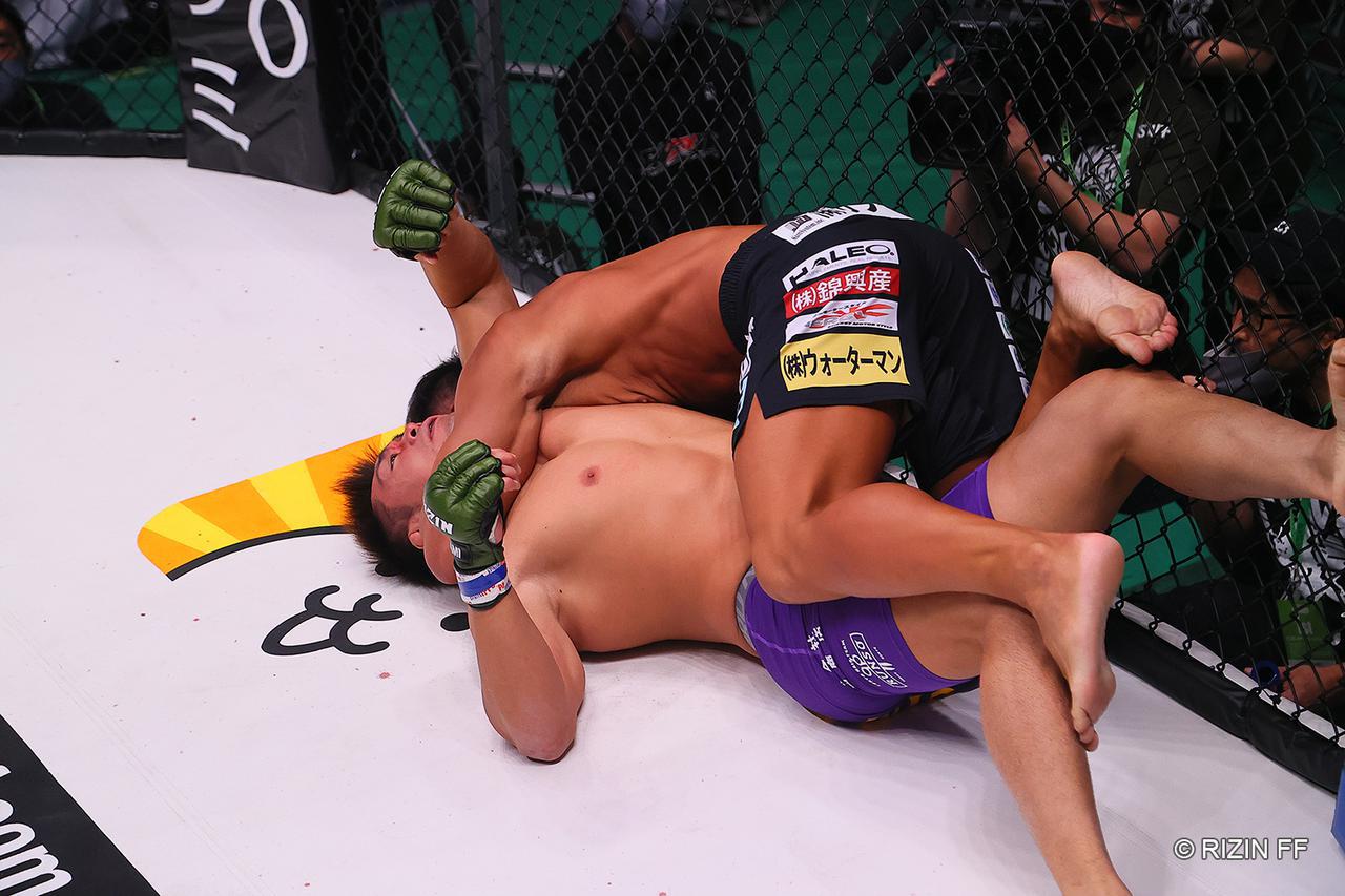 케이지에 기댄 채 순간 굳어 버린 상대에게 재차 통렬한 추적 라이트 스트레이트를 꼽아 다운을 뽑은 키이치는 스탬핑과 파운딩을 고집하는 대신 초반 실패했던 암 트라이앵글을 재차 시도했다. 상대가 케이지에 몸을 대고 넘어진 탓에 좁았던 것을 키이치가 어떻게든 몸을 쑤셔넣어 공간을 만들어 암 트라이앵글을 완성하자 견디지 못한 카와나가가 탭을 쳤다.