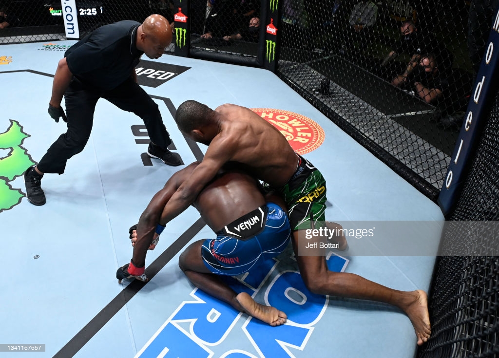 UFC 유일의 가이아나 파이터 칼스톤 해리슨(34)는 단체 데뷔 전 서브미션 한판 승에 이어 이번엔 펀치 TKO승으로 UFC 입성 후 첫 연승행진을 시작했다. 국내단체 AFC 웰터급 챔프를 지낸 사샤 팔라트니코프를 잡고 연승을 노리는 임파 카상가나이(27, 미국)의 턱에 라이트를 꽂아 스턴을 뽑은 해리슨이 그대로 러쉬를 시작했다. 다시 카운터 레프트로 다운을 뽑아낸 후, 해리슨이 터틀 상태인 카상가나이의 한 쪽 팔을 감아잡아 봉쇄 후, 안면에 파운딩 샤워로 승부를 결정지었다.